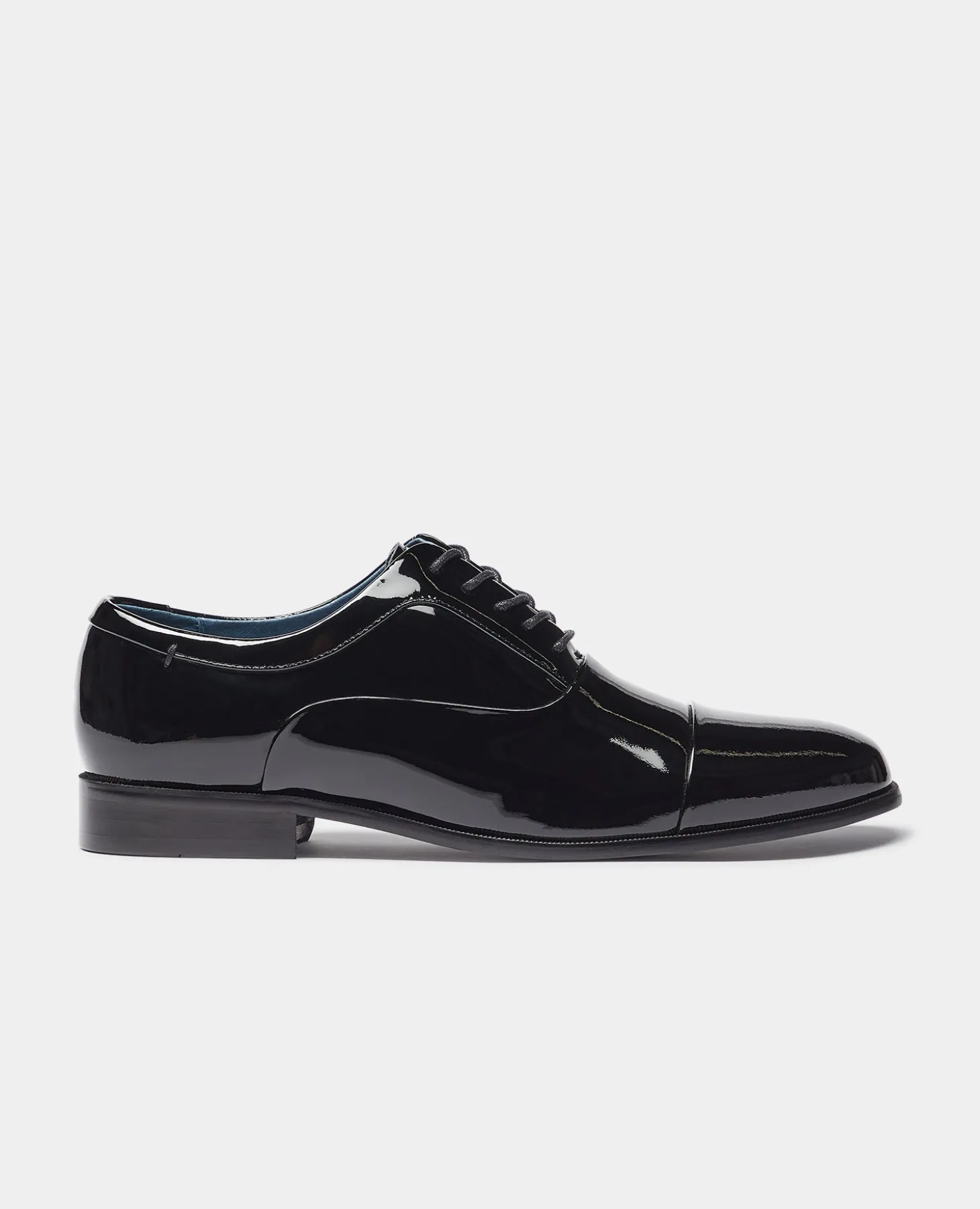 Prato patent leather Oxford shoe in black. Toe cap. Lace fastening with 5 eyelets. Synthetic welt and sole with stitching detail. Leather sock and lining.