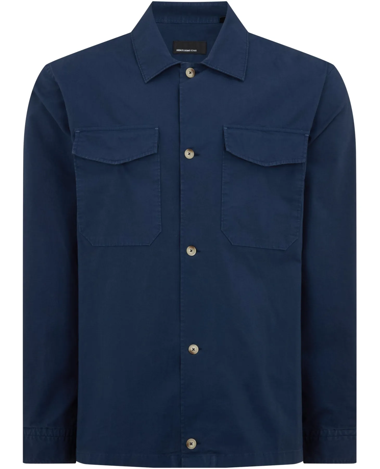 Navy regular fit cotton-stretch long sleeve overshirt with a cutaway collar style, french front button down, double chest pockets with concealed buttoned flaps. Bar tack on chest pockets and sleeve vents. Back yoke loop finished off with a flat hem.