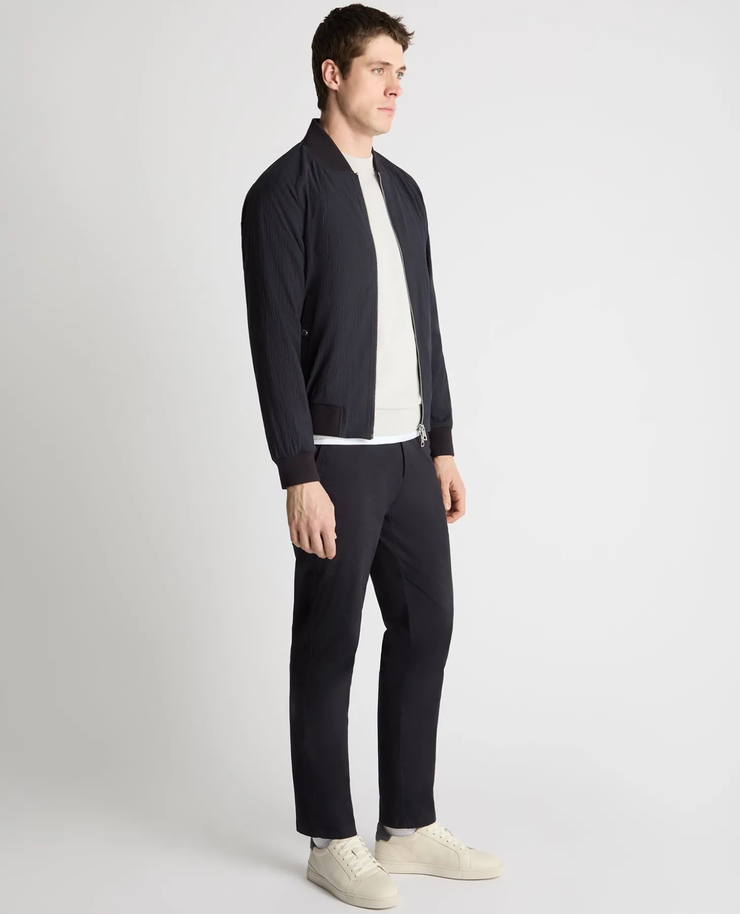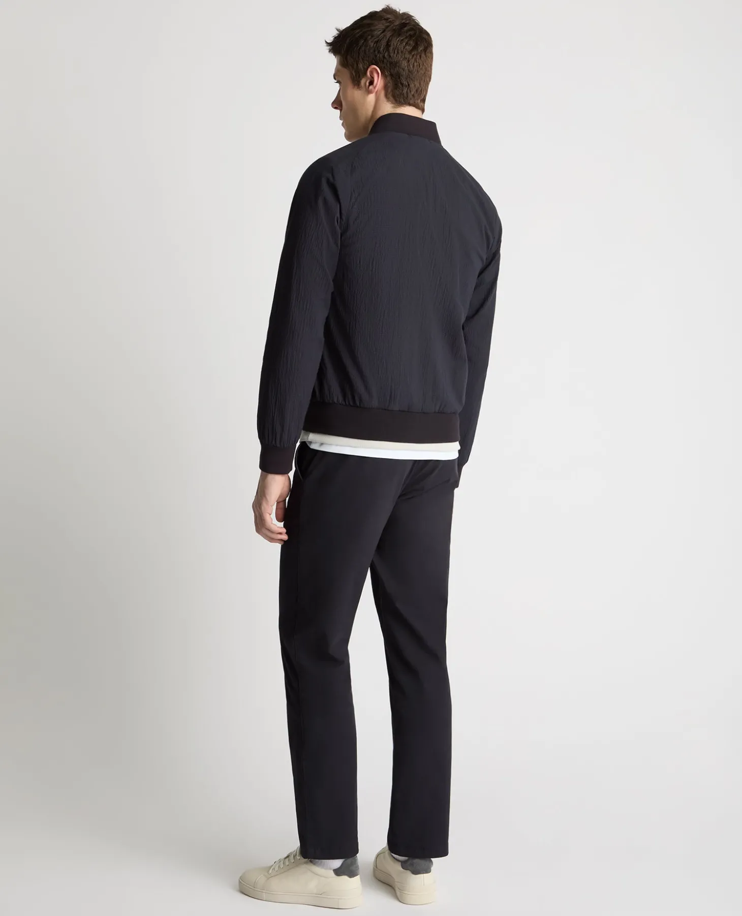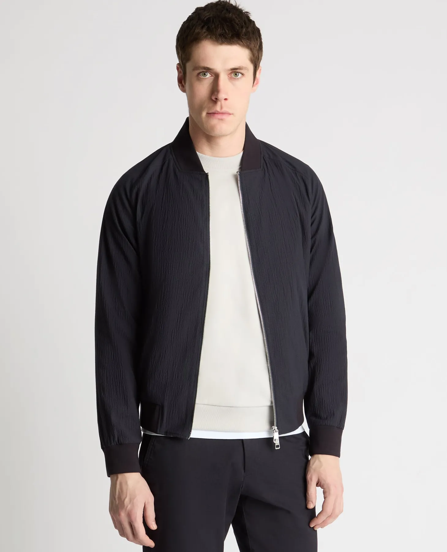 A fresh take on a classic bomber, built for warmer days on the go. Cut from a cotton-stretch fabric with a seersucker texture, this jacket sits slightly away from the skin to improve airflow, keeping things comfortable when the day heats up.