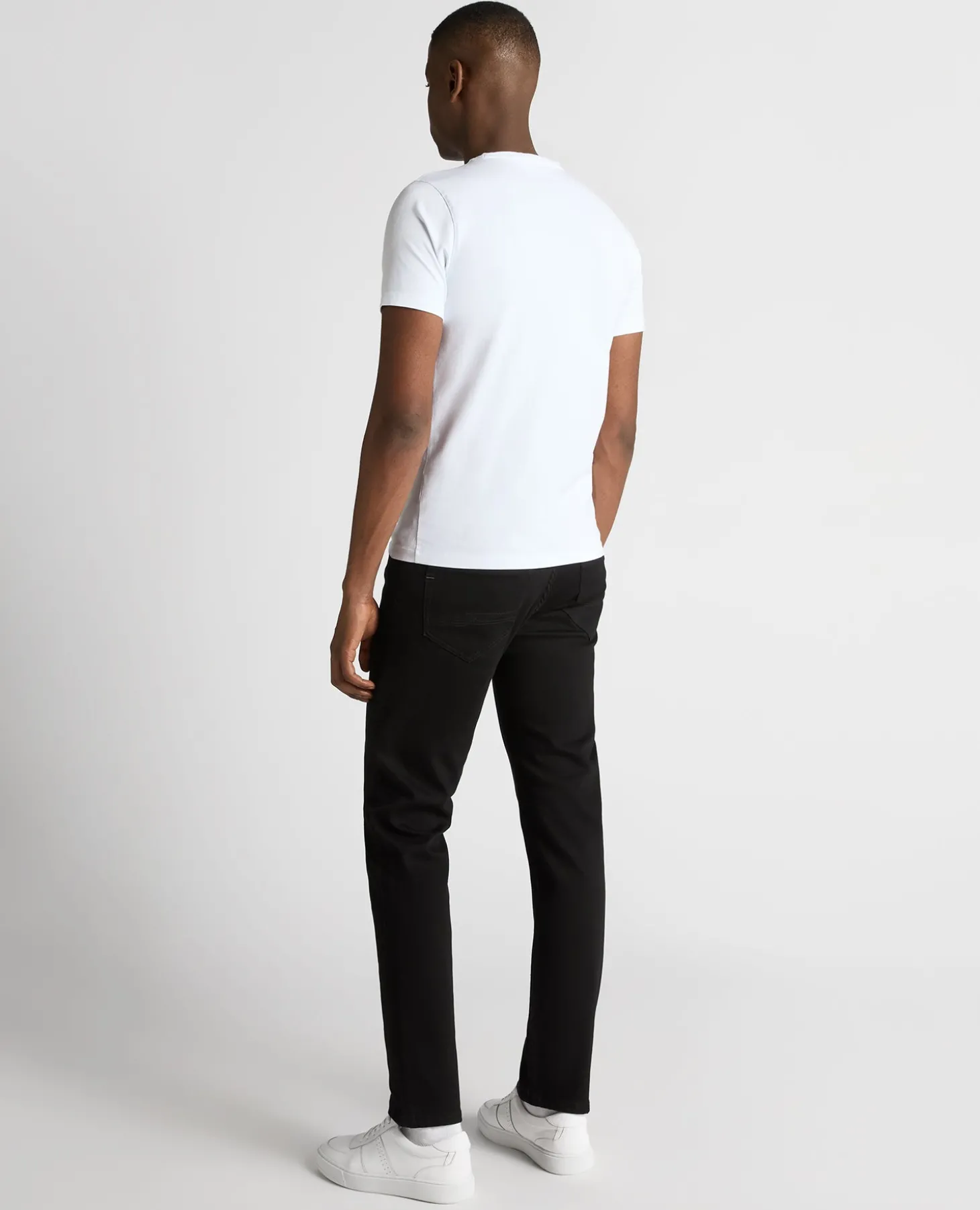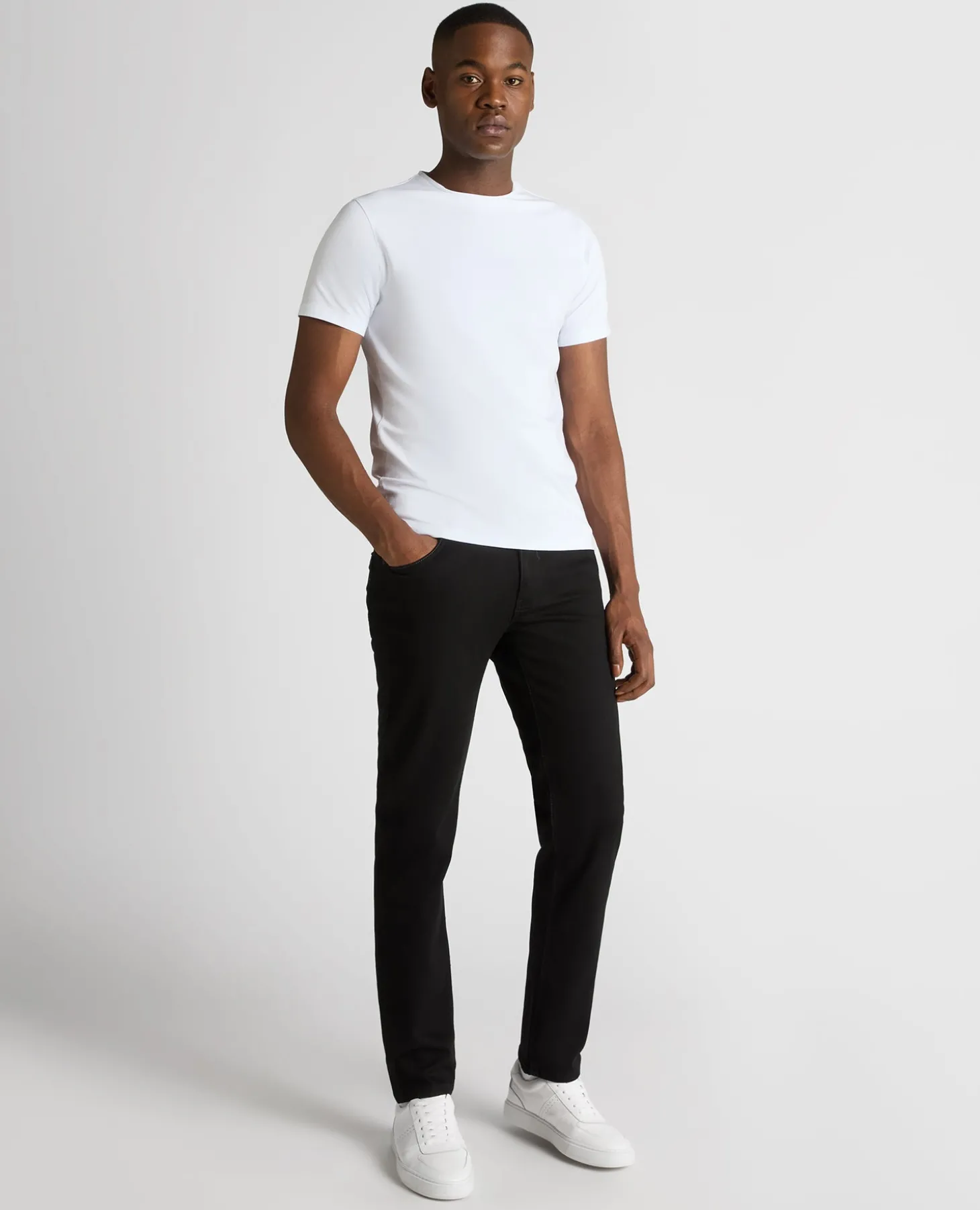 Model is 6’2” /188cm tall and wears straight leg jeans, size 34R. Straight leg is a more generous cut with more room through the seat, leg and at the hem.