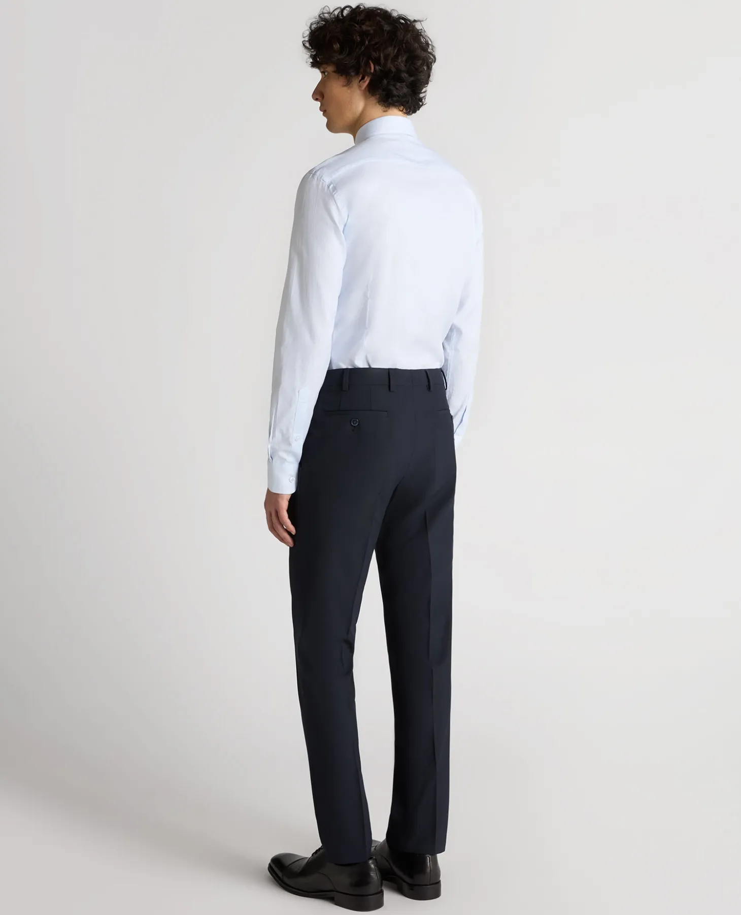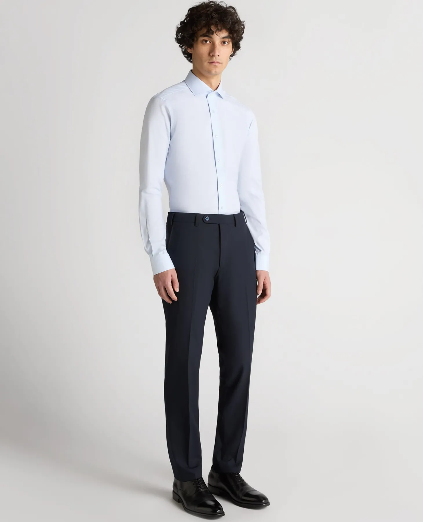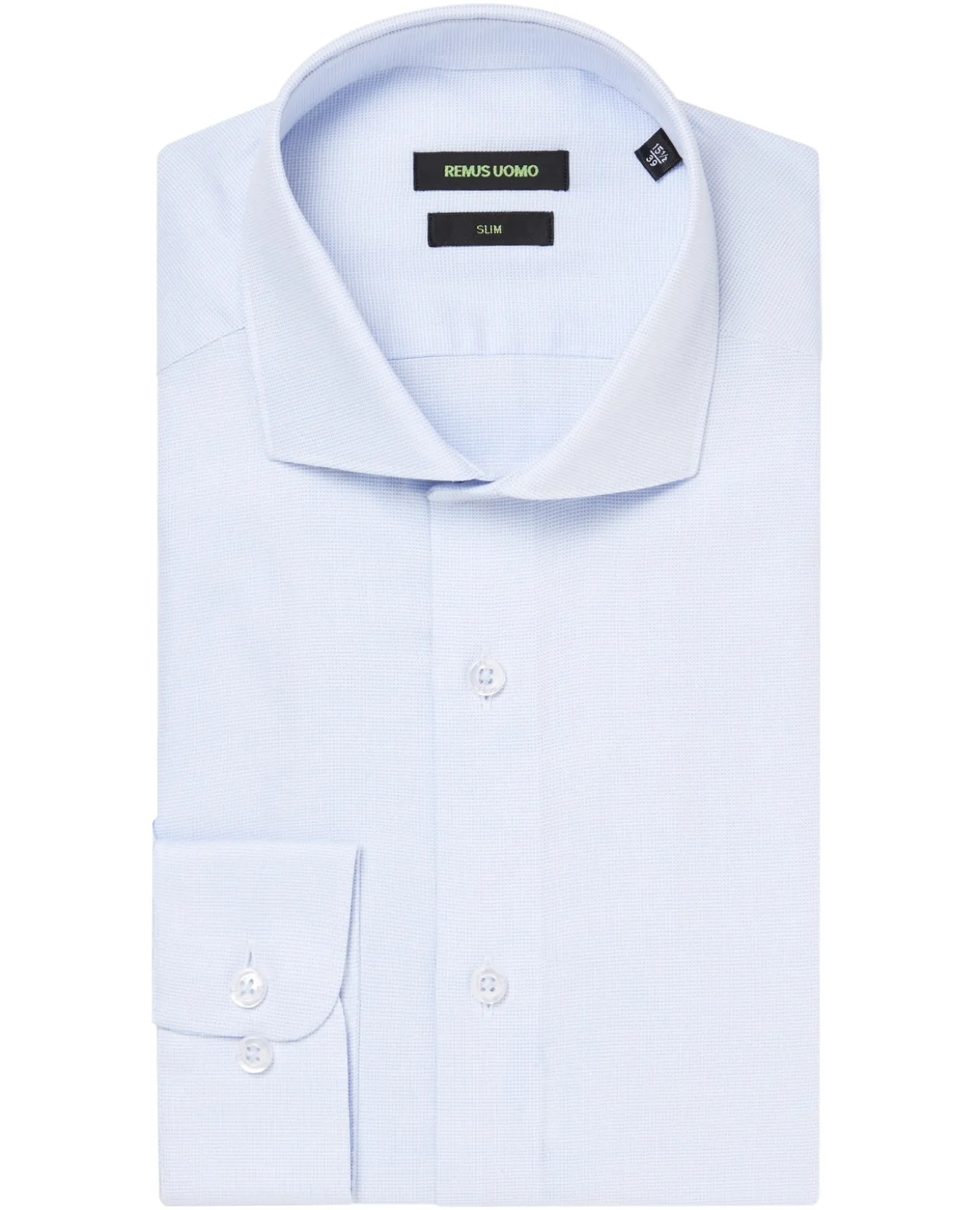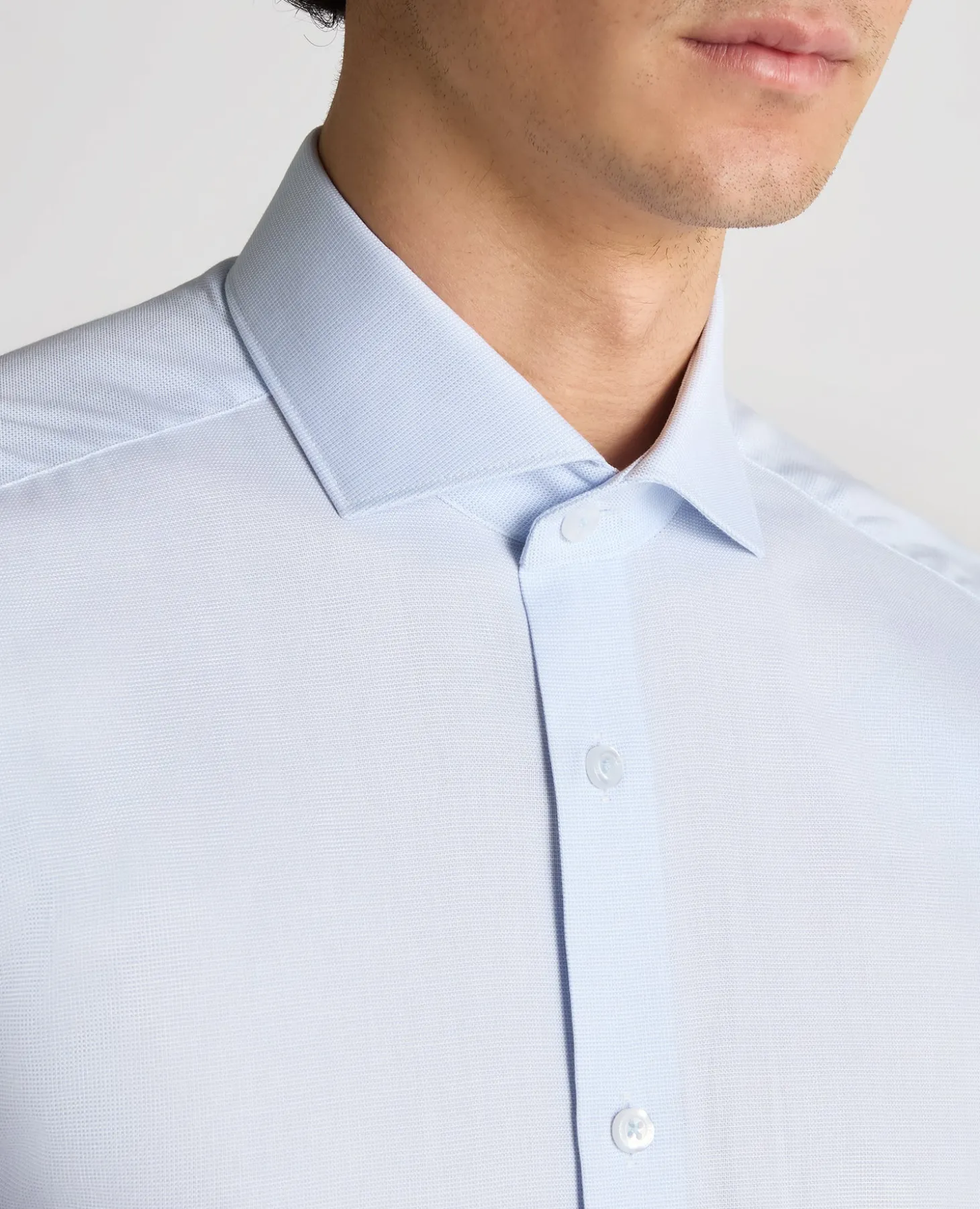 , cutaway collar, trimmed with white buttons and tonal button stitching