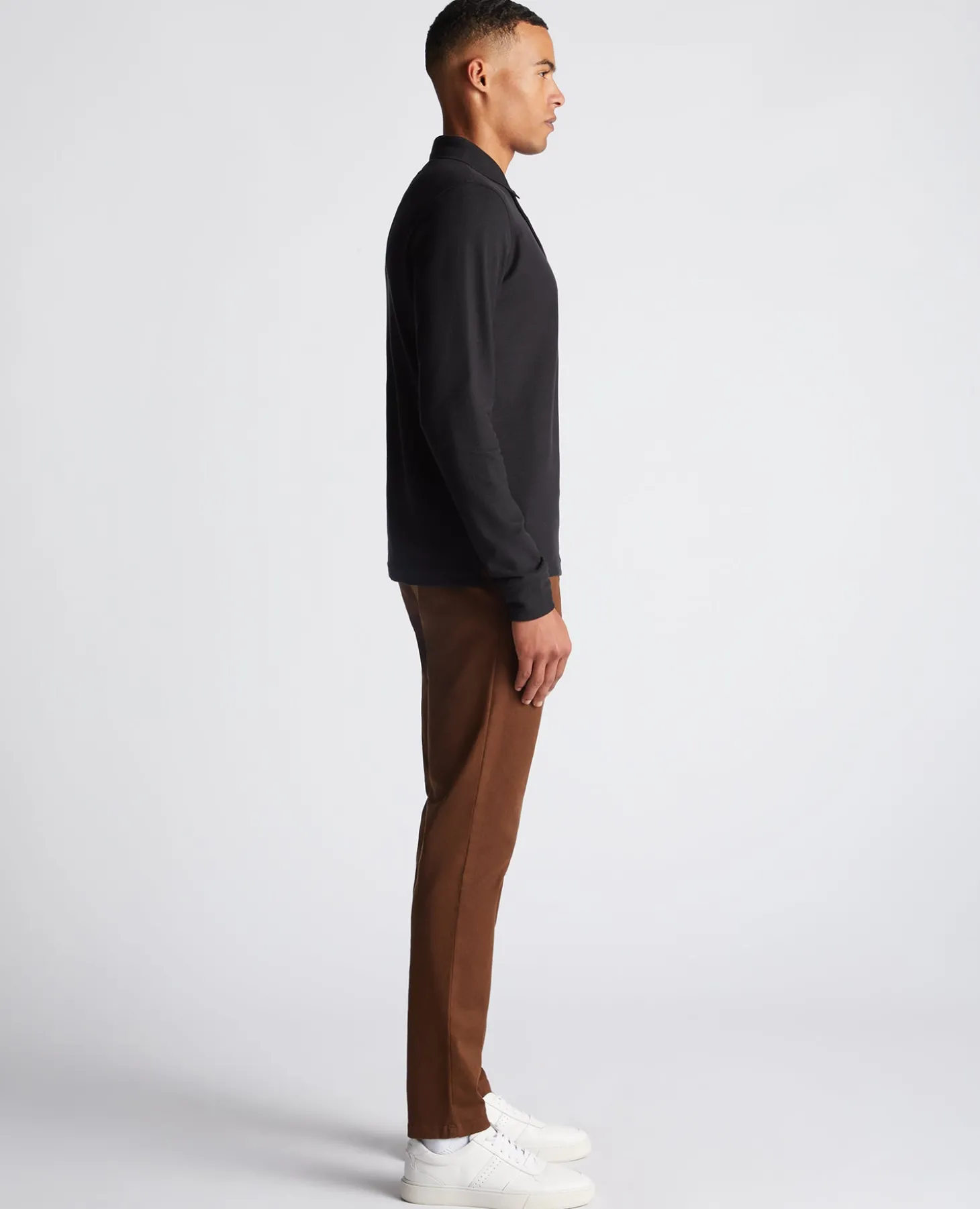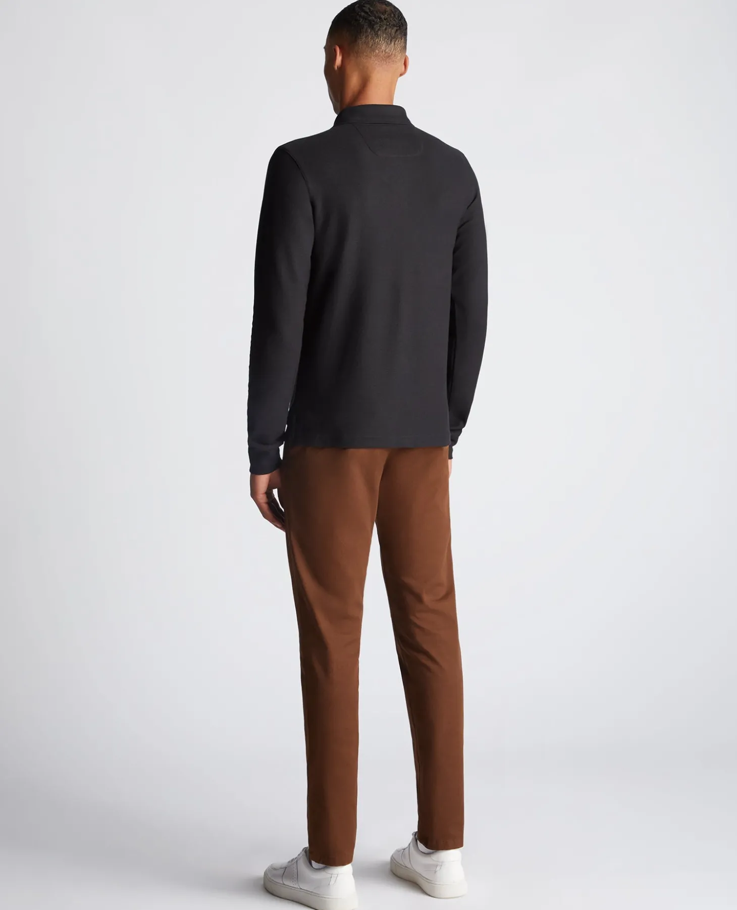 Black slim fit cotton-stretch long sleeve pique polo with chest embroidary, contrast tipping on the collar and three button closing. If you prefer an easier fit , we recommend sizing up for this garment.