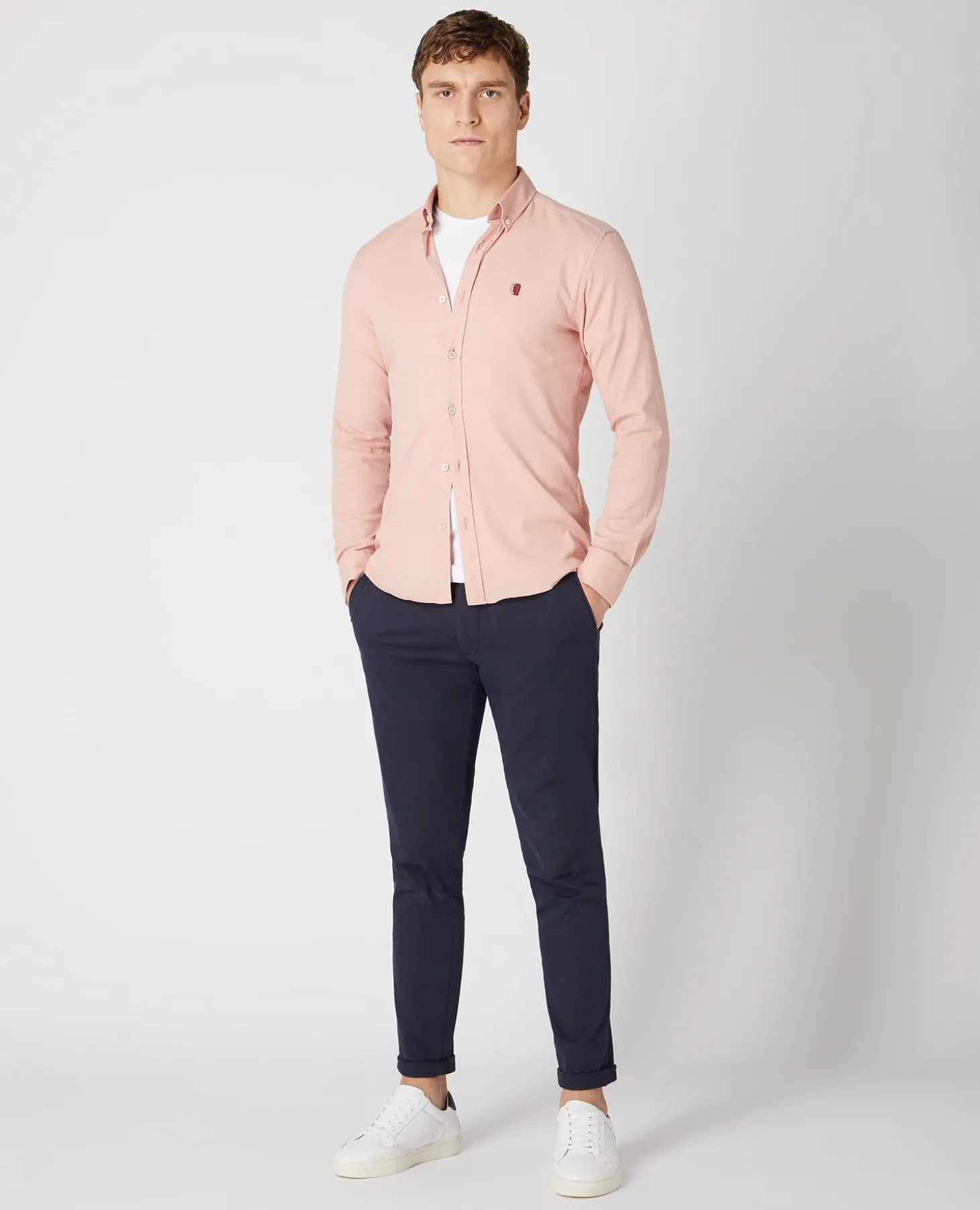 Pink slim fit cotton-stretch shirt with a pointed button down collar, placket front with an inverted back pleat, back yoke loop and tailed hem.