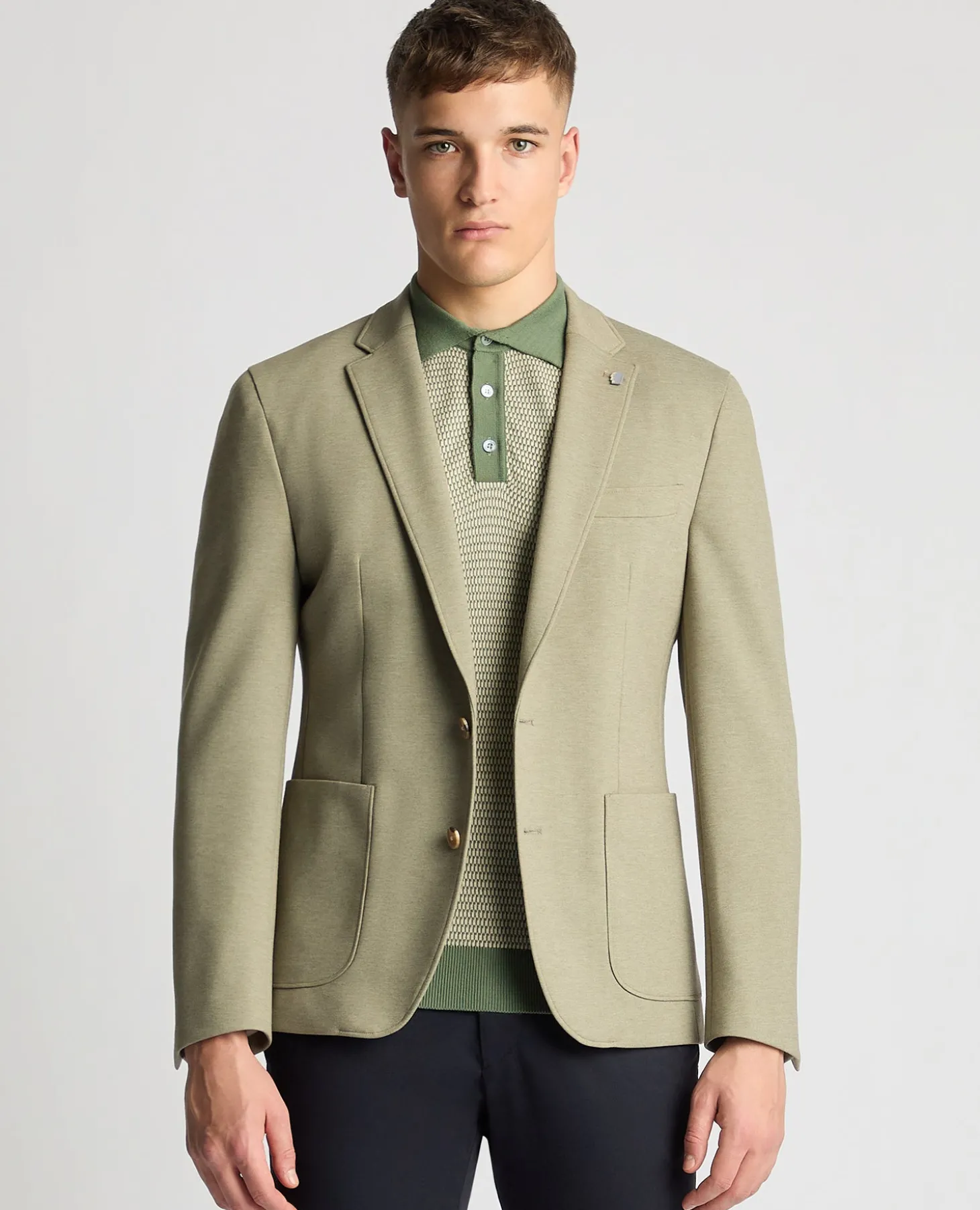Model is 6’3”/190cm tall and wears a slim fit jacket, size 40R. Our slim fit jackets are expertly tailored to create the perfect slim silhouette, designed for a narrower appearance through the shoulders, arms and chest.