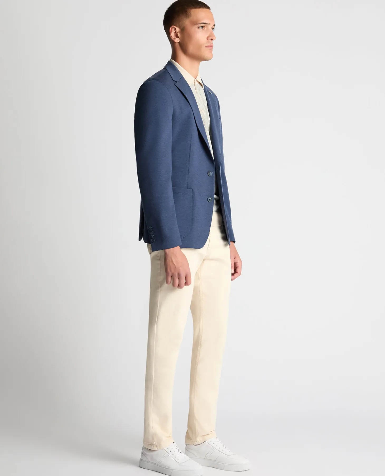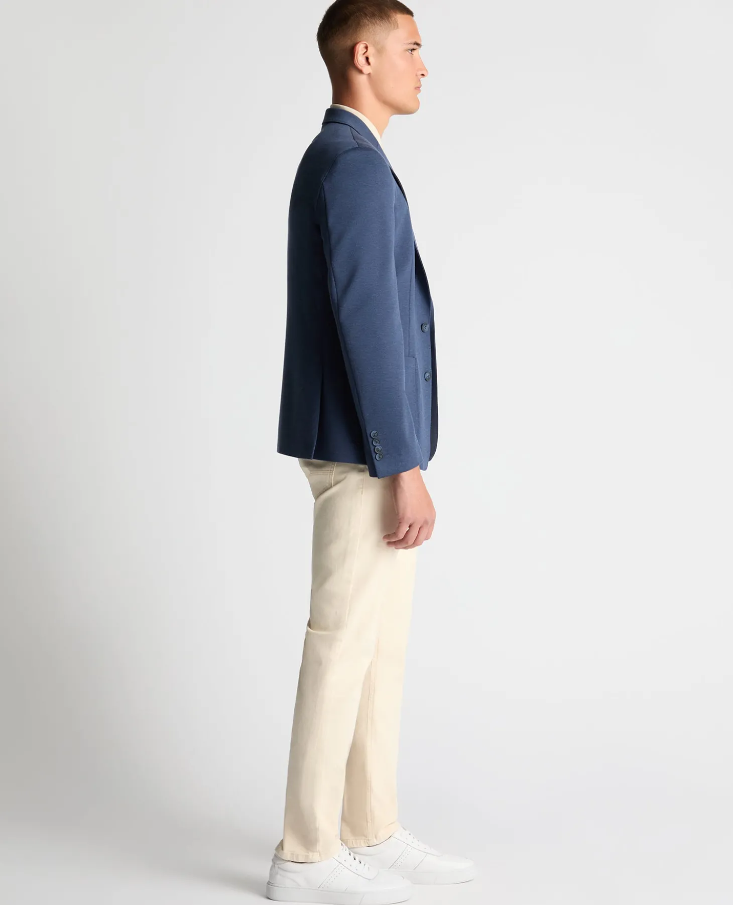 Model is 6’3”/190cm tall and wears a slim fit jacket, size 40R. Our slim fit jackets are expertly tailored to create the perfect slim silhouette, designed for a narrower appearance through the shoulders, arms and chest.