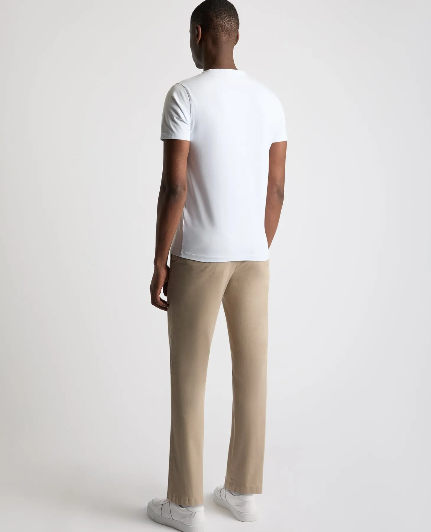 Model is 6’2” /188cm tall and wears a straight leg chino, size 34R. Straight leg is a more generous cut with more room through the seat, leg and at the hem.