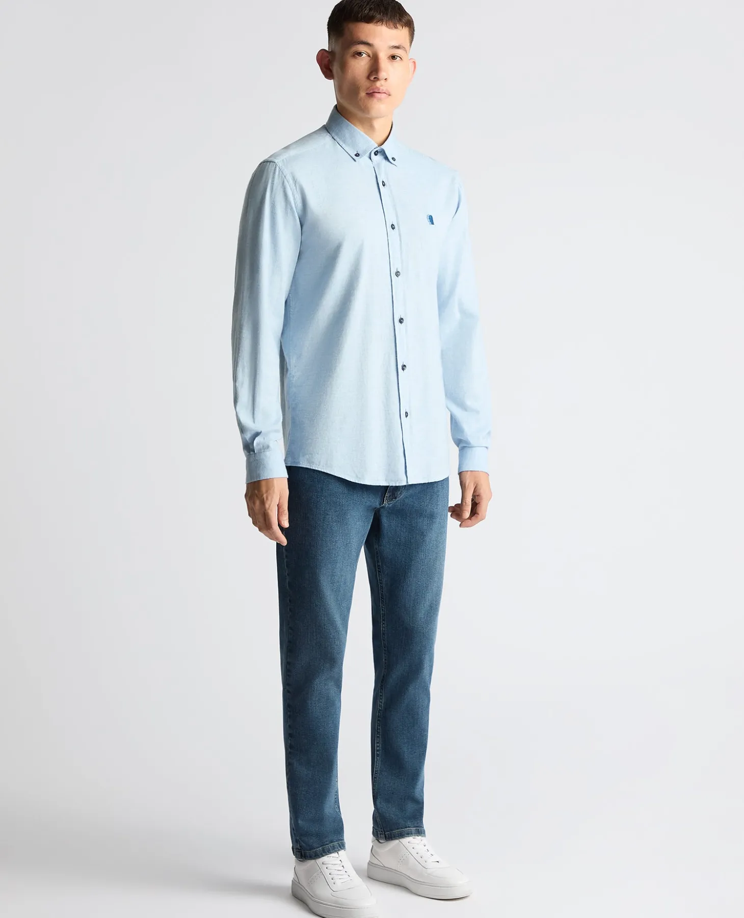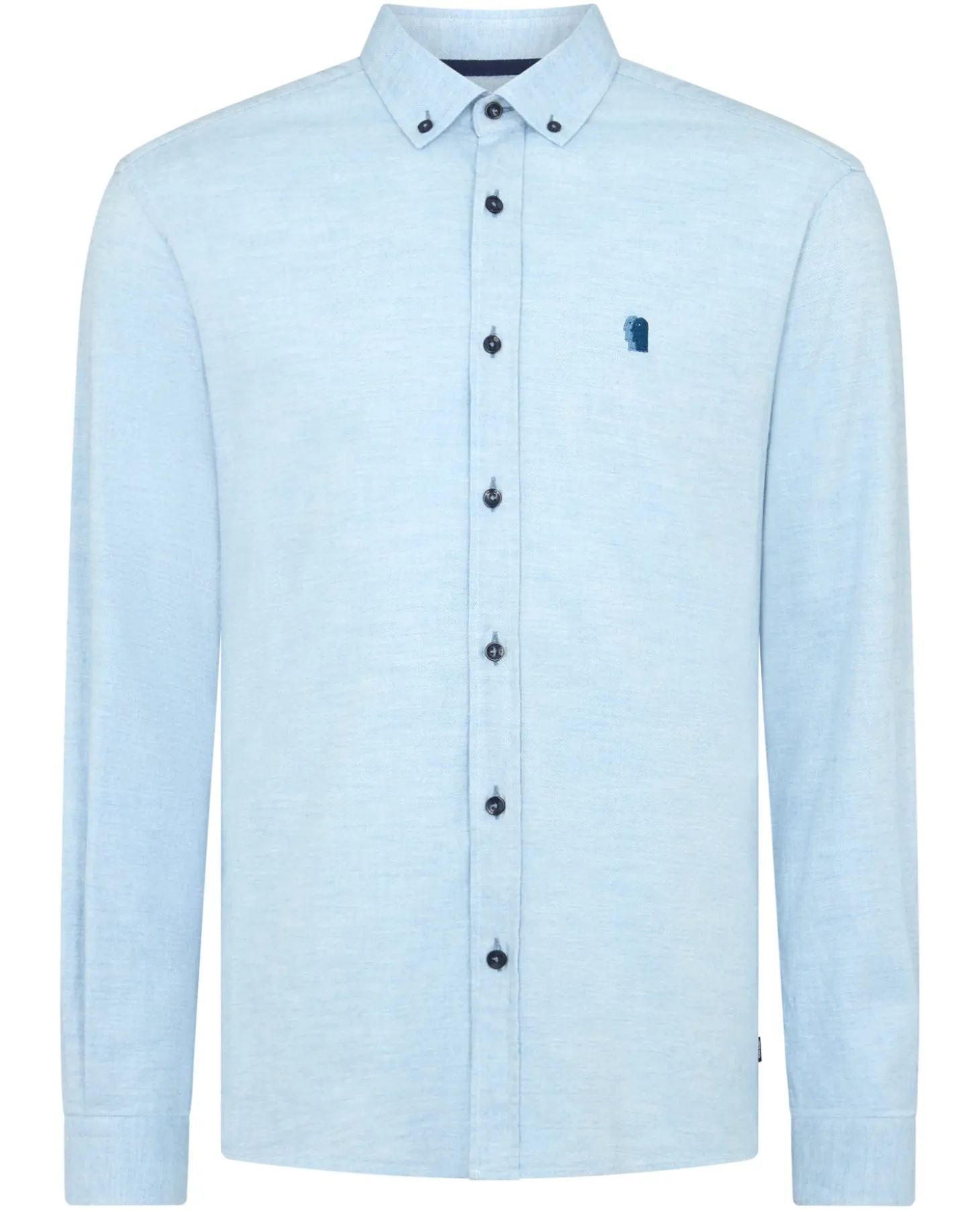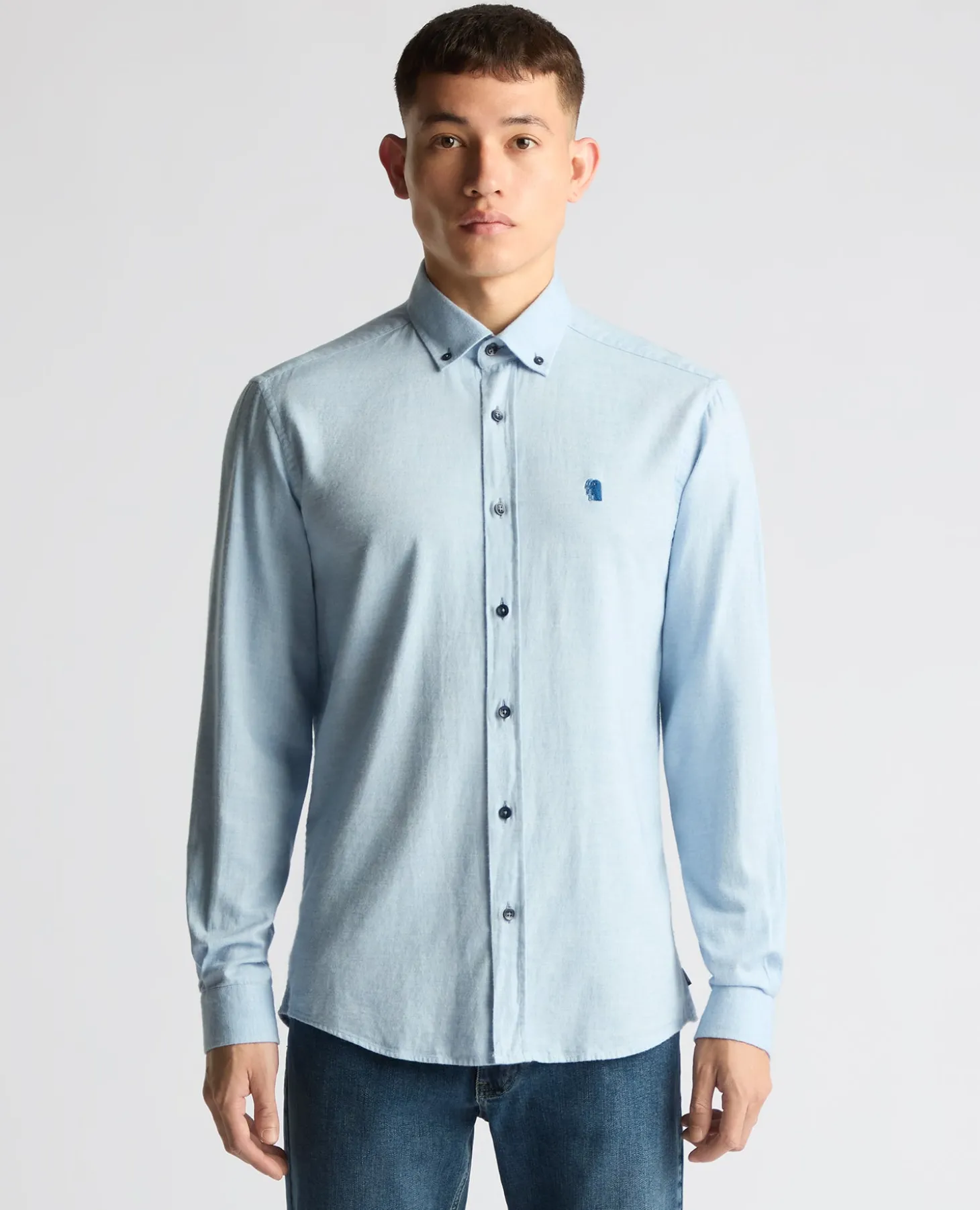 Light blue tapered fit shirt. Soft brushed cotton feel. Buttoned down collar, placket front, contrast ribbon, chest embroidery with a back yoke loop and tailed hem.