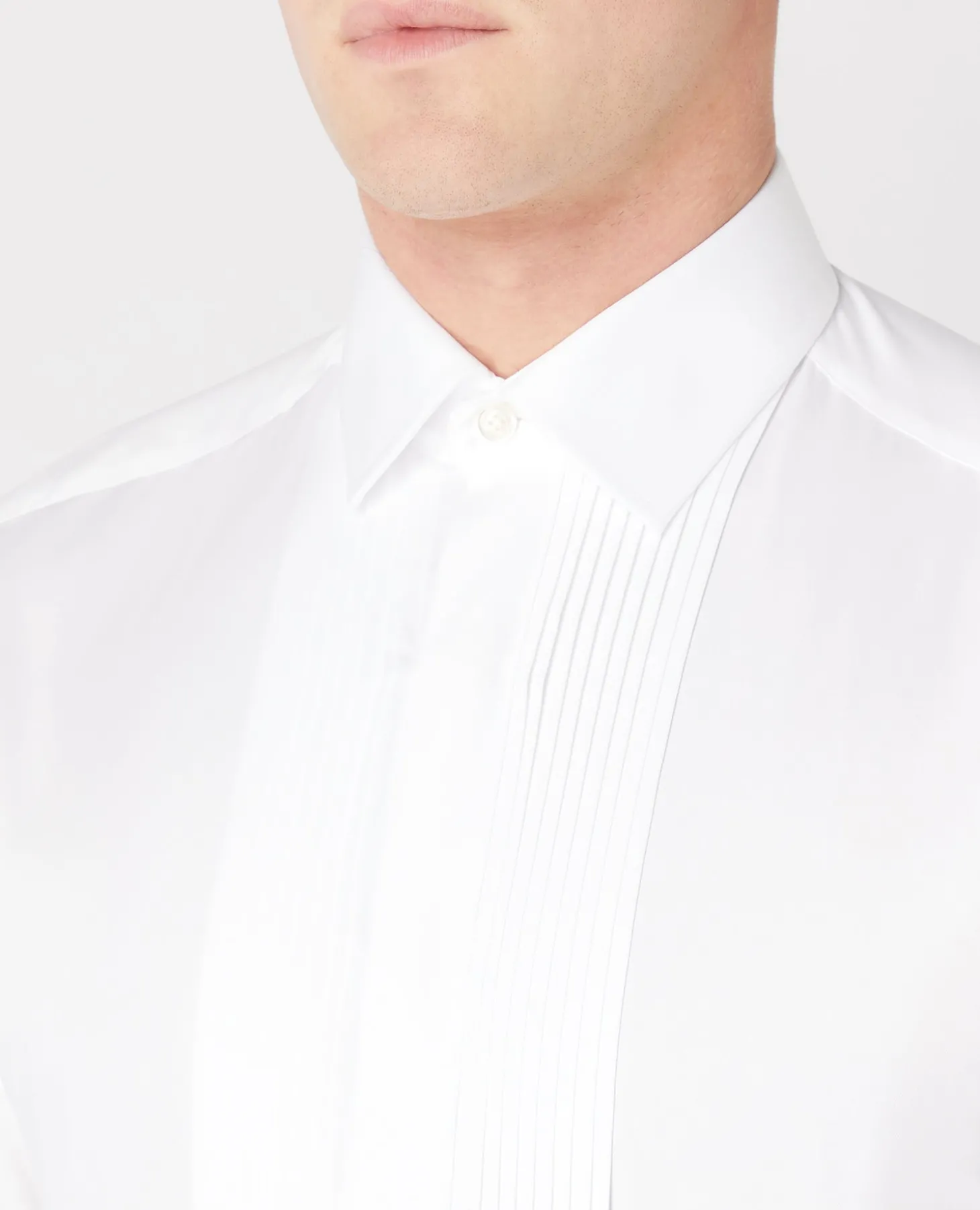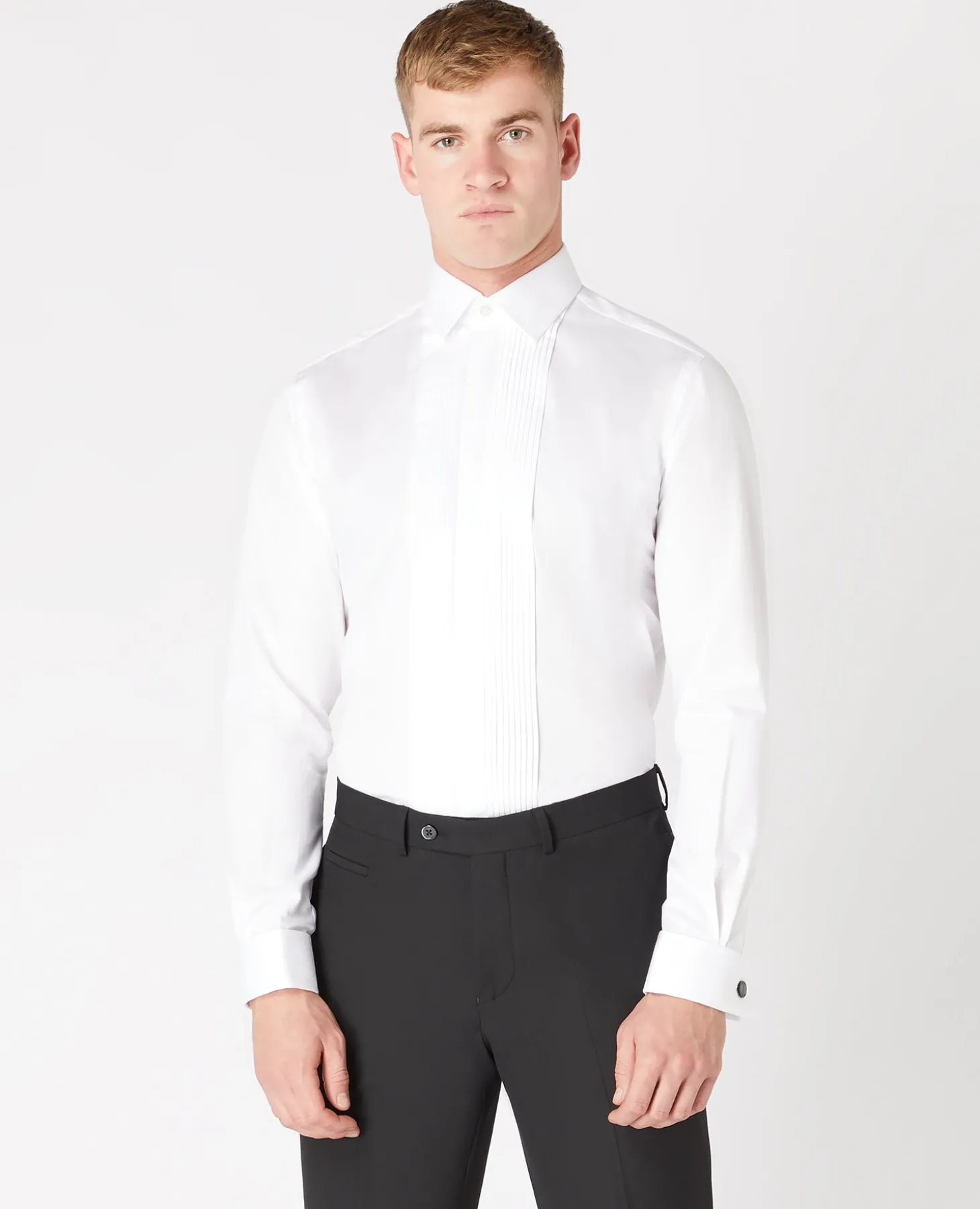 Well constructed and confidently put together, this dress shirt looks the part from the first button to the last. The smooth cotton-blend fabric delivers a crisp finish, while the classic plisse front keeps it rooted in formal tradition. Reach for it for black-tie moments, weddings, or anytime the dress code calls for something a bit special.