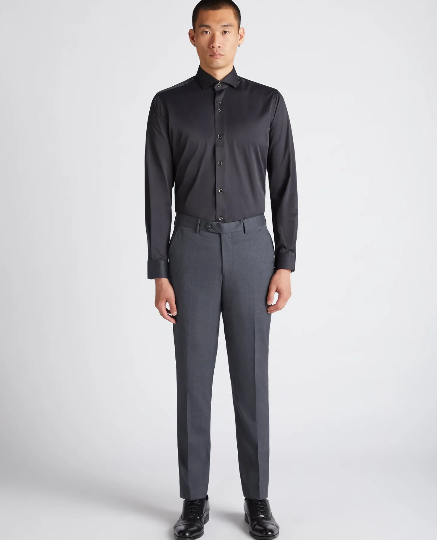 Model is 6’1”/187cm tall and wears a tapered fit shirt with a 15.5 inch collar. Model has a 40” chest and 32” waist.