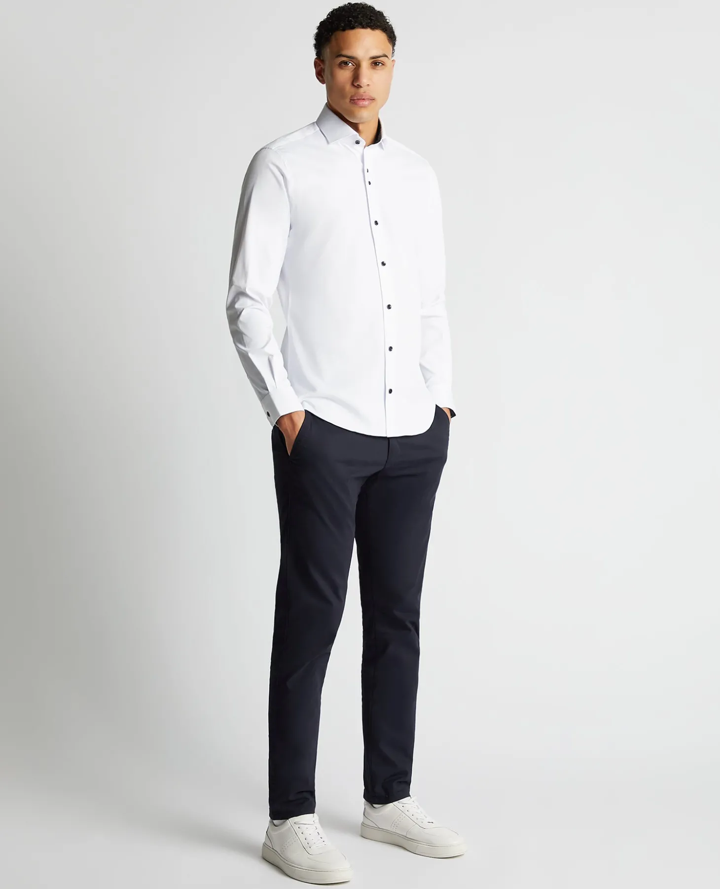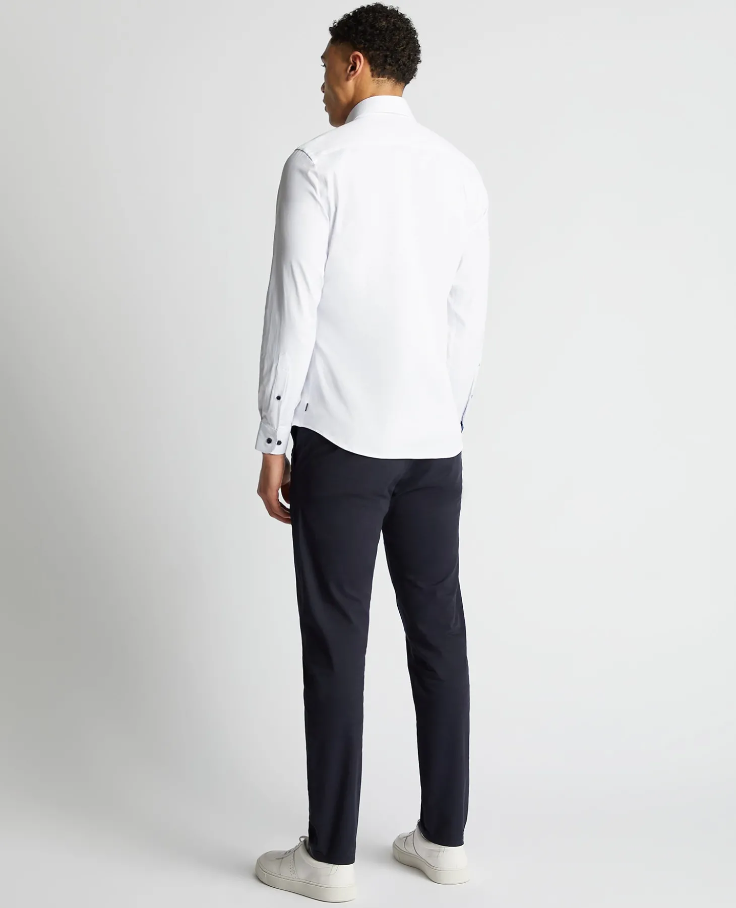 White tapered fit cotton-blend stretch shirt, contrast innder collar, concealed button down, and slightly cut away collar.