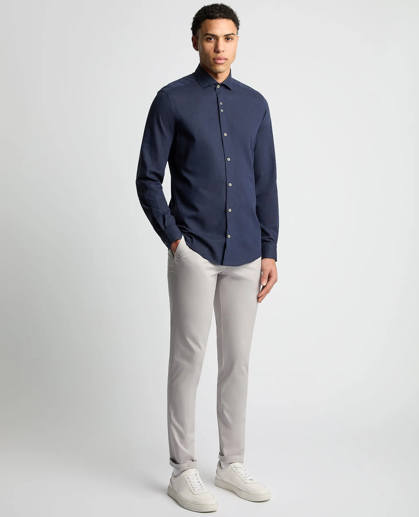 Navy tapered fit long sleeve shirt. Cut away collar, french front, concealed button down, round cuff and tailed hem. This shirt is 70% Cotton and 30% Linen, making it the perfect spring/summer wardrobe staple.