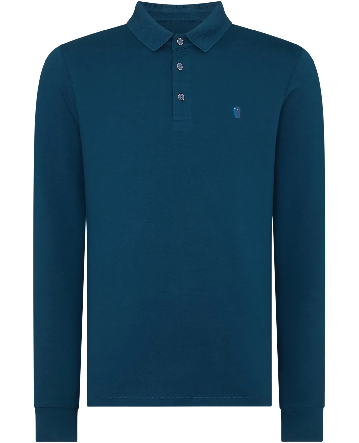 Dark blue tapered fit cotton-stretch long-sleeve polo shirt with brand mark on the chest and three button closing.