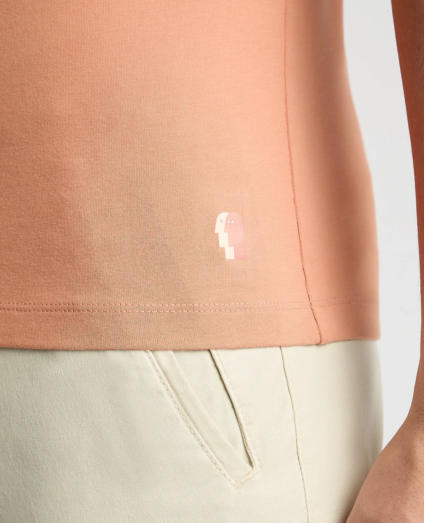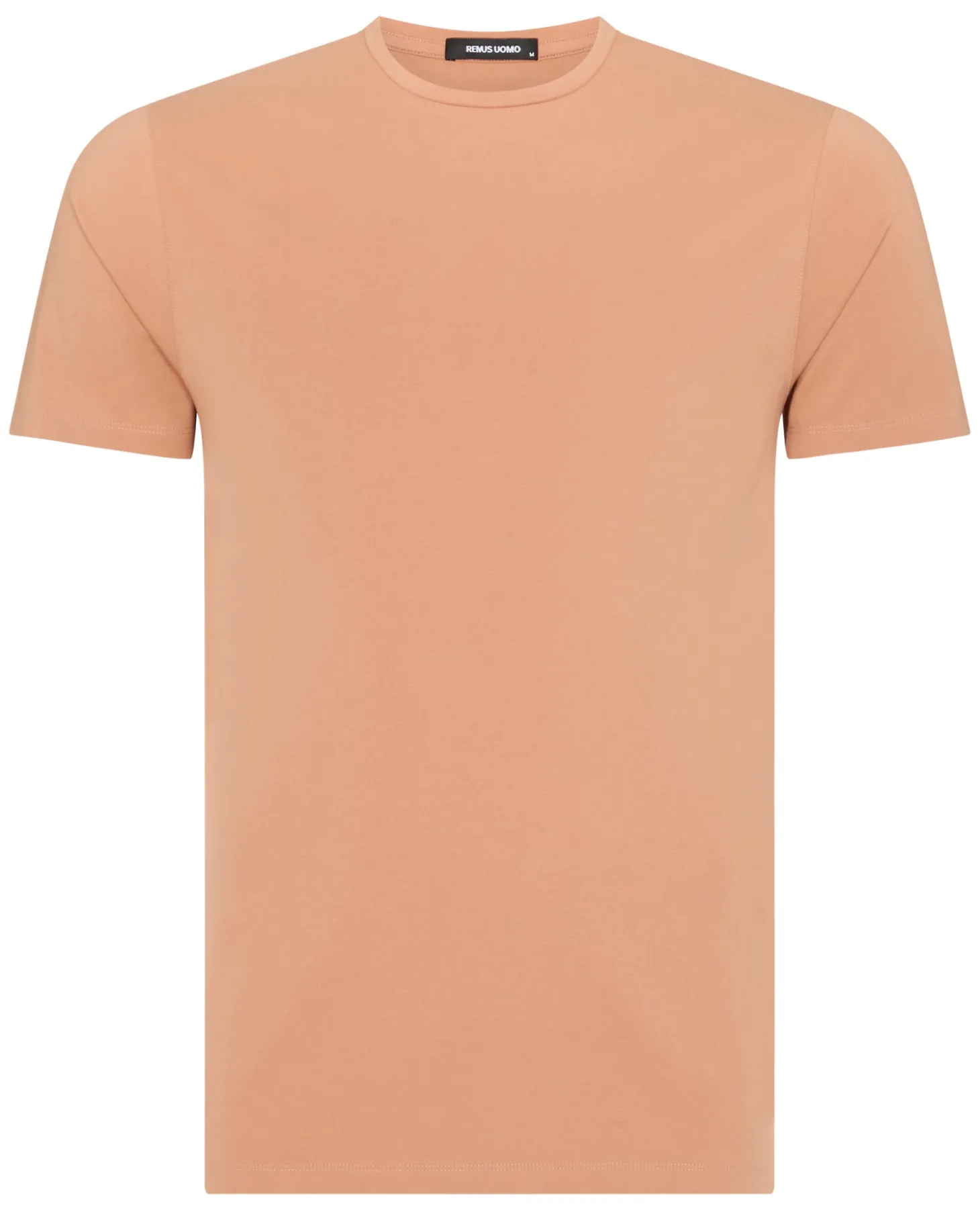 Terracotta tapered fit short sleeve crew neck t-shirt in cotton stretch jersey with brotherhood brand mark on hip.
