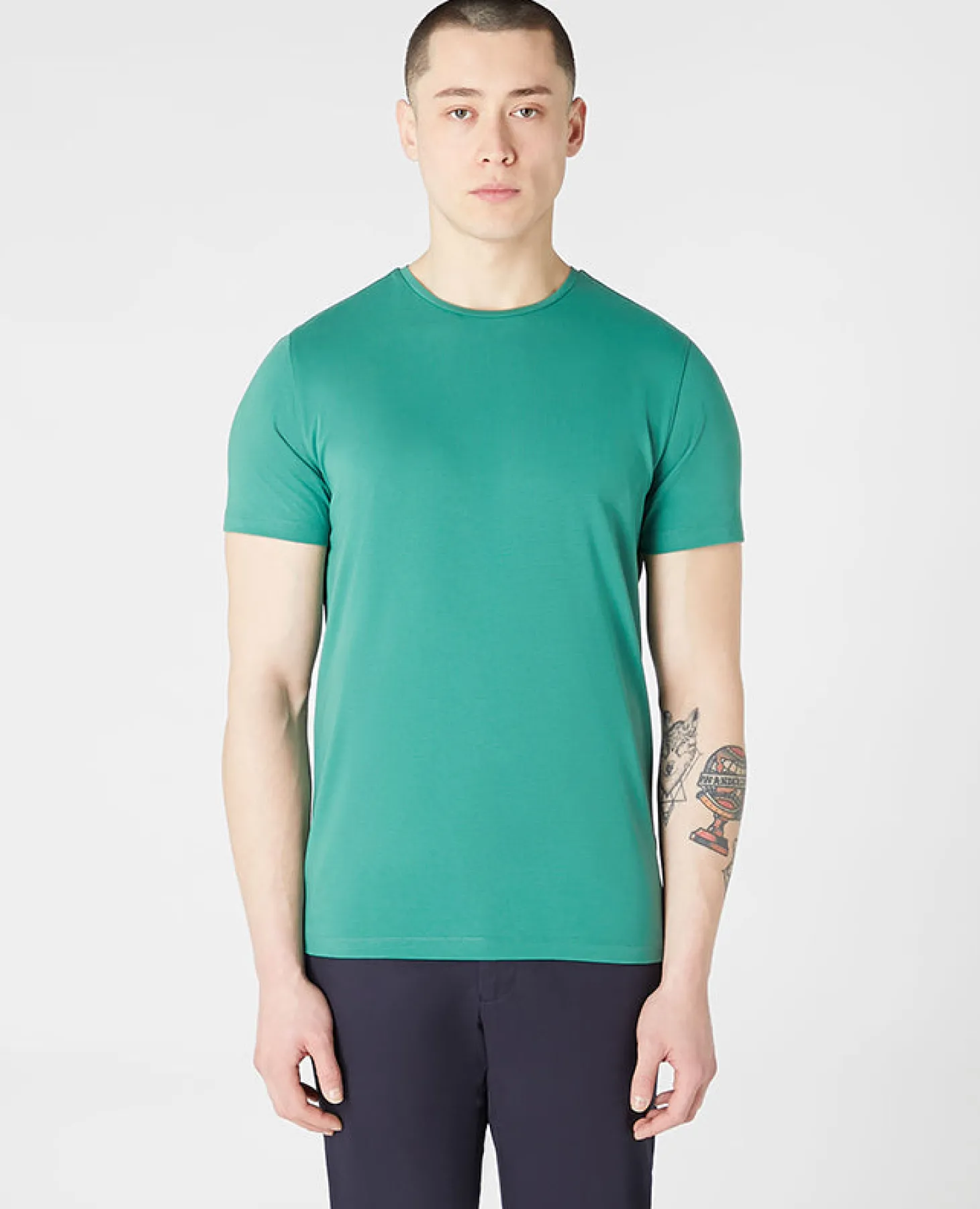 Green tapered fit cotton-stretch crew neck t-shirt with brotherhood embroidery.