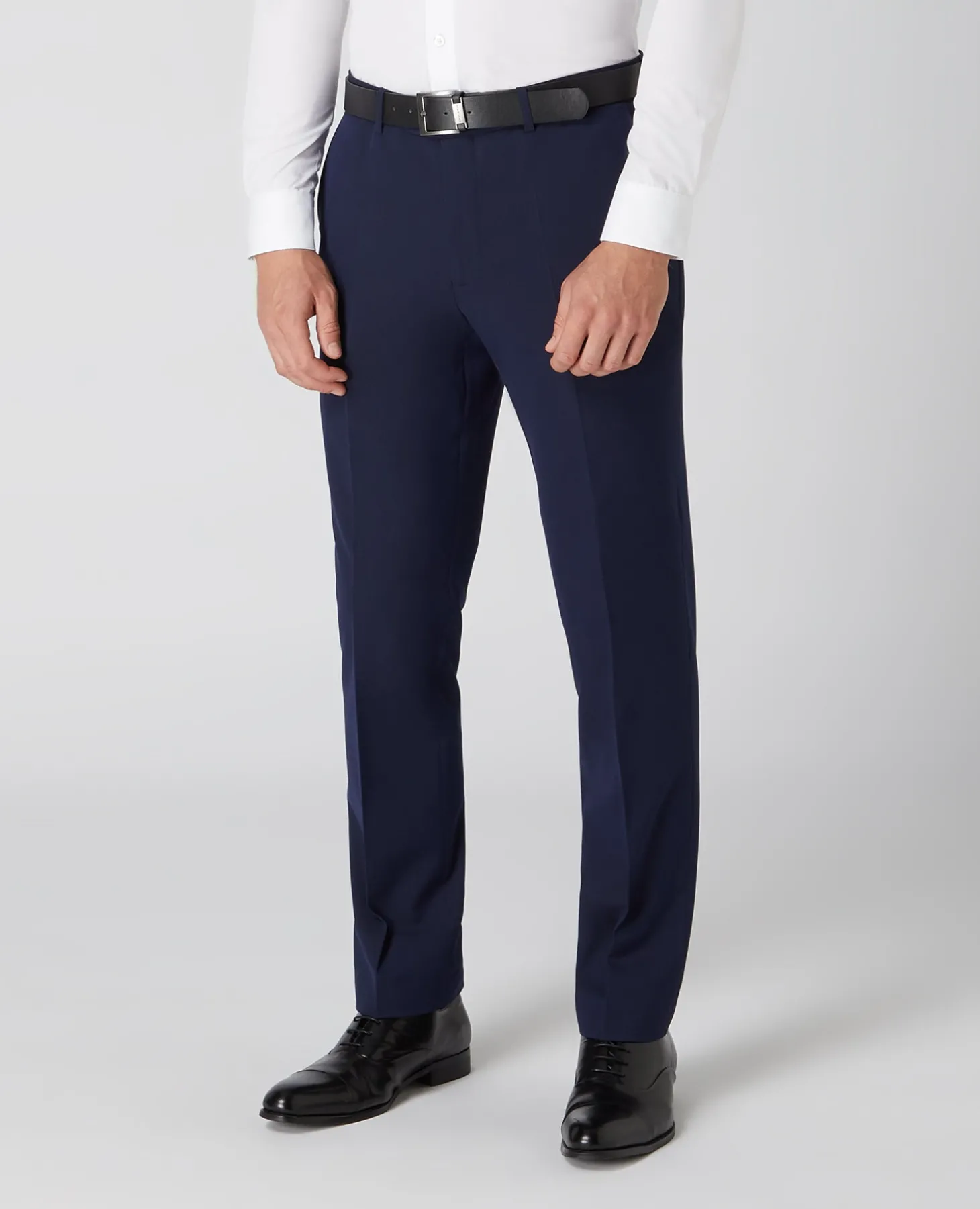 Navy tapered fit formal trousers with stretch fabric and contrast stitch details. Mid rise, slim seat and thigh with slim hem.