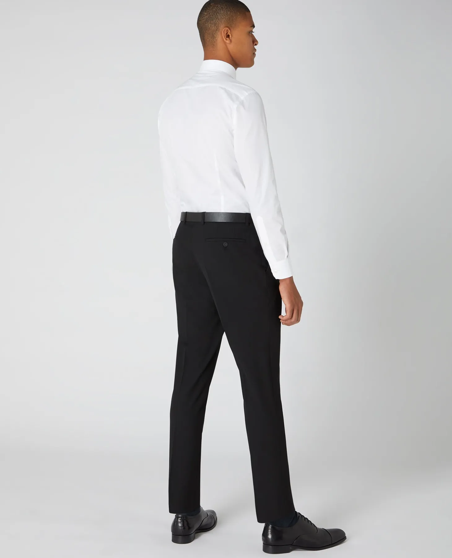 Black tapered fit formal trousers with stretch fabric and contrast stitch details. Mid rise, slim seat and thigh with slim hem.