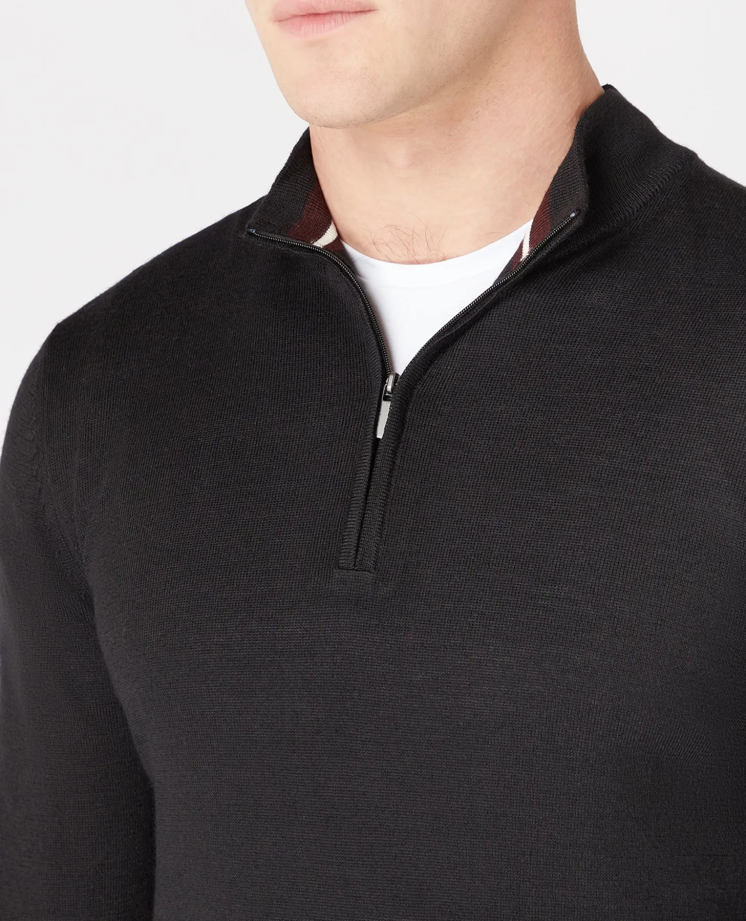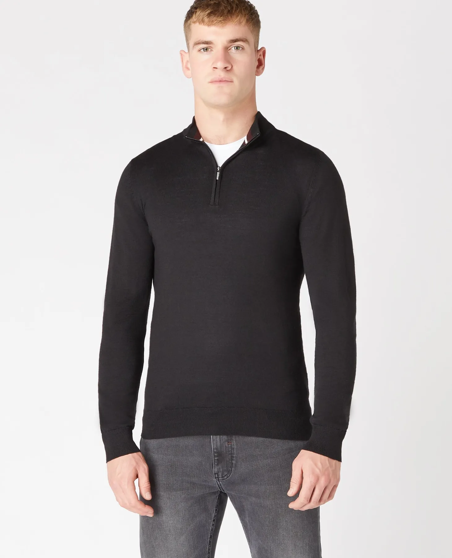 Black tapered fit merino wool-blend half zip long sleeve, single bed knit sweater with contrast inside collar details and ribbed cuff and hem.