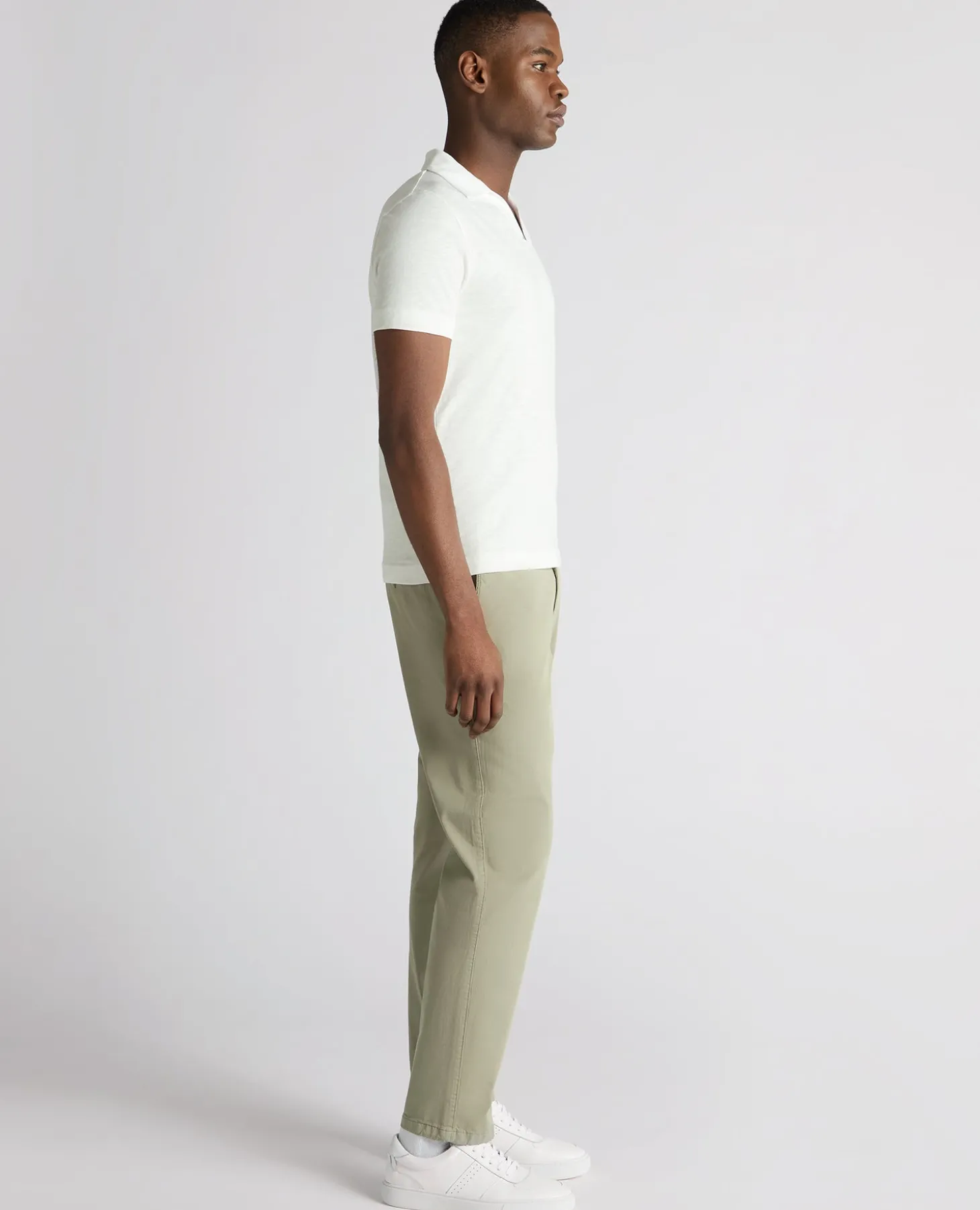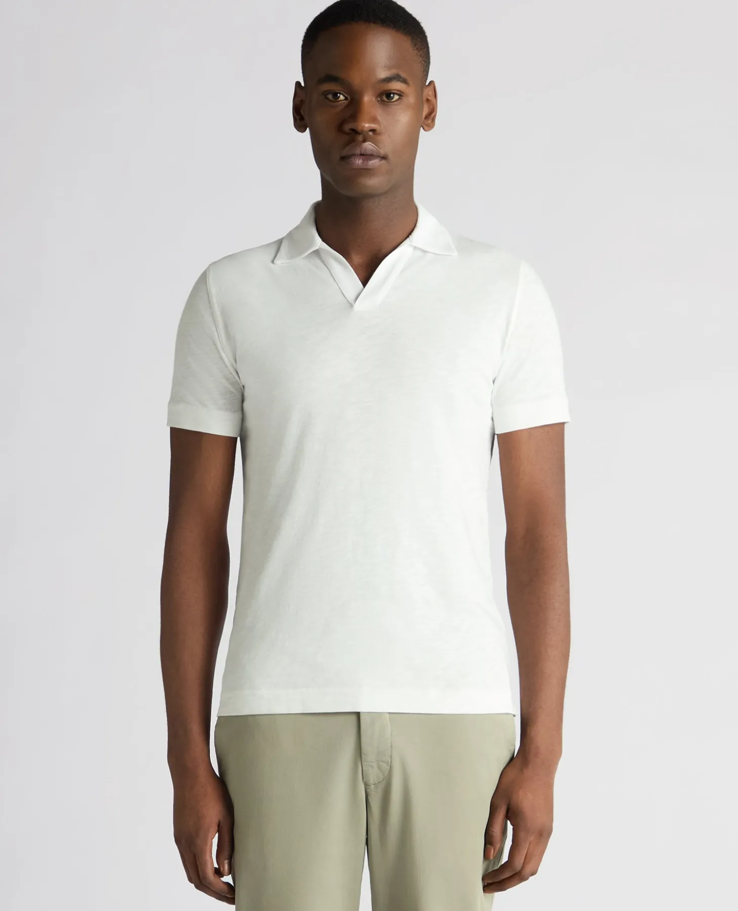 White tapered fit cotton open collar polo in single jersey slub yarn. Lightweight and breathable in 100% Cotton, making it the perfect polo for spring/summer.