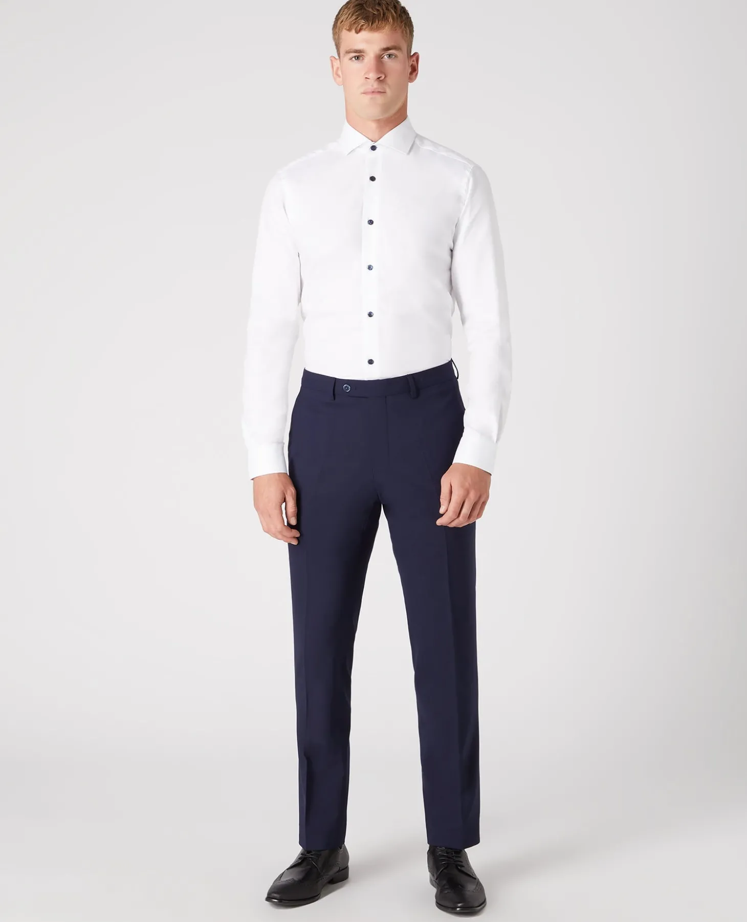 Model is 6’2” /188cm tall and wears a trouser size 34R. Tapered fit is a more generous cut with more room through the leg and at the hem, while still maintaining a tailored silhouette.