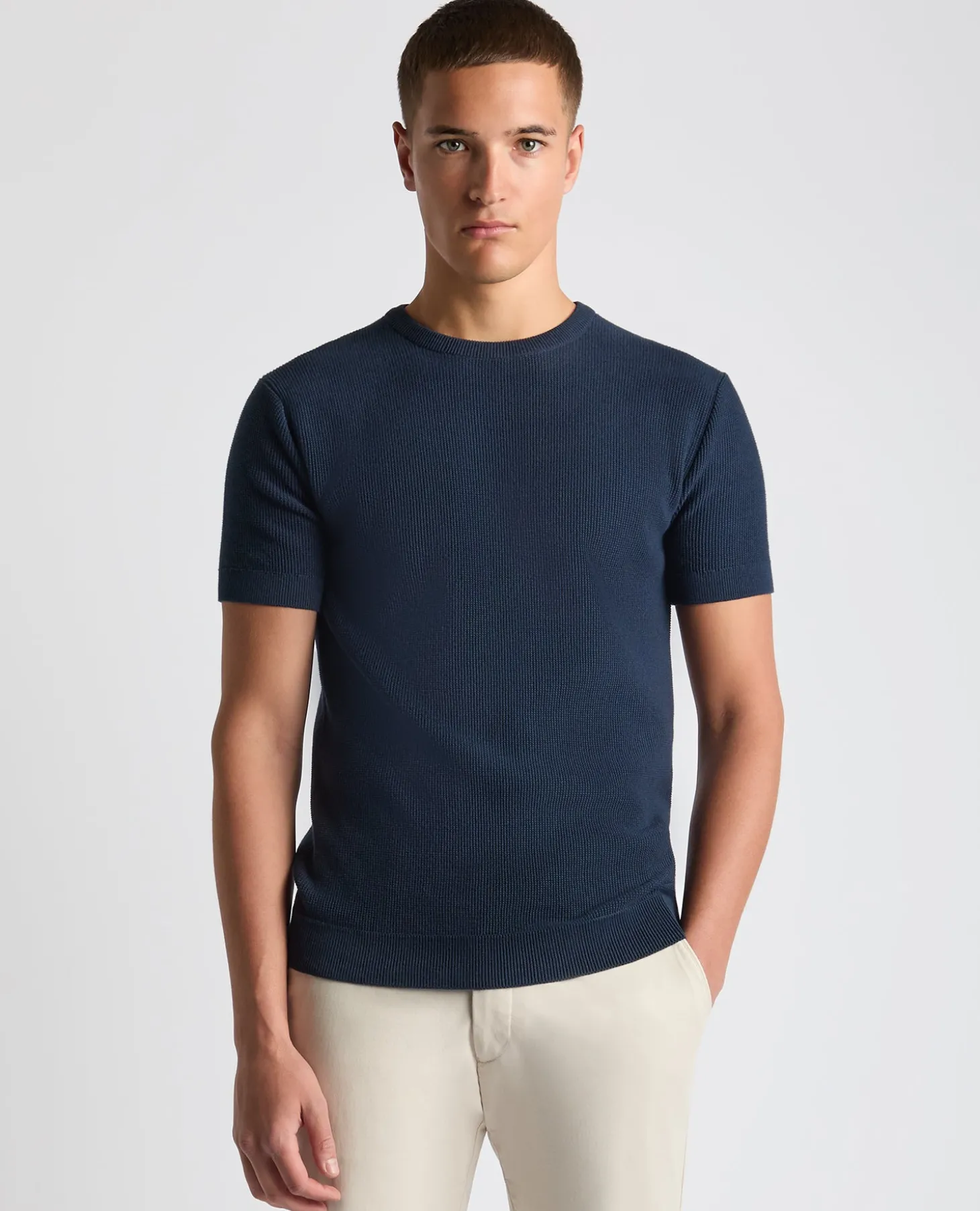 Not your average T-shirt. This knitted crew is crafted from pure cotton with a waffle-knit structure that adds texture, breathability, and more substance than a standard tee. Easy to style on its own and ideal for layering, it brings a more considered feel to everyday dressing. Pair with chinos for a more refined look or keep it casual with denim. It s a simple upgrade that makes a difference without trying too hard.