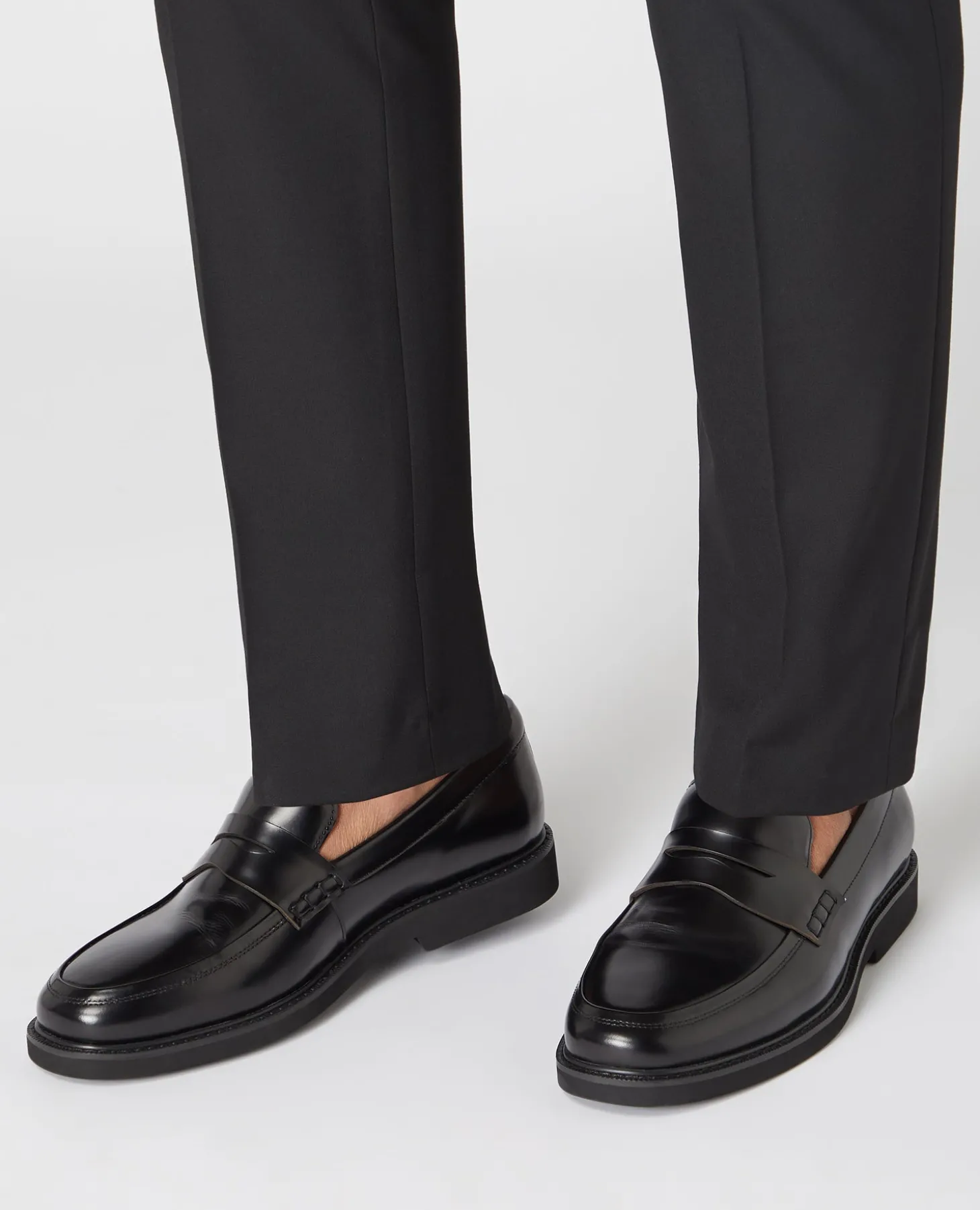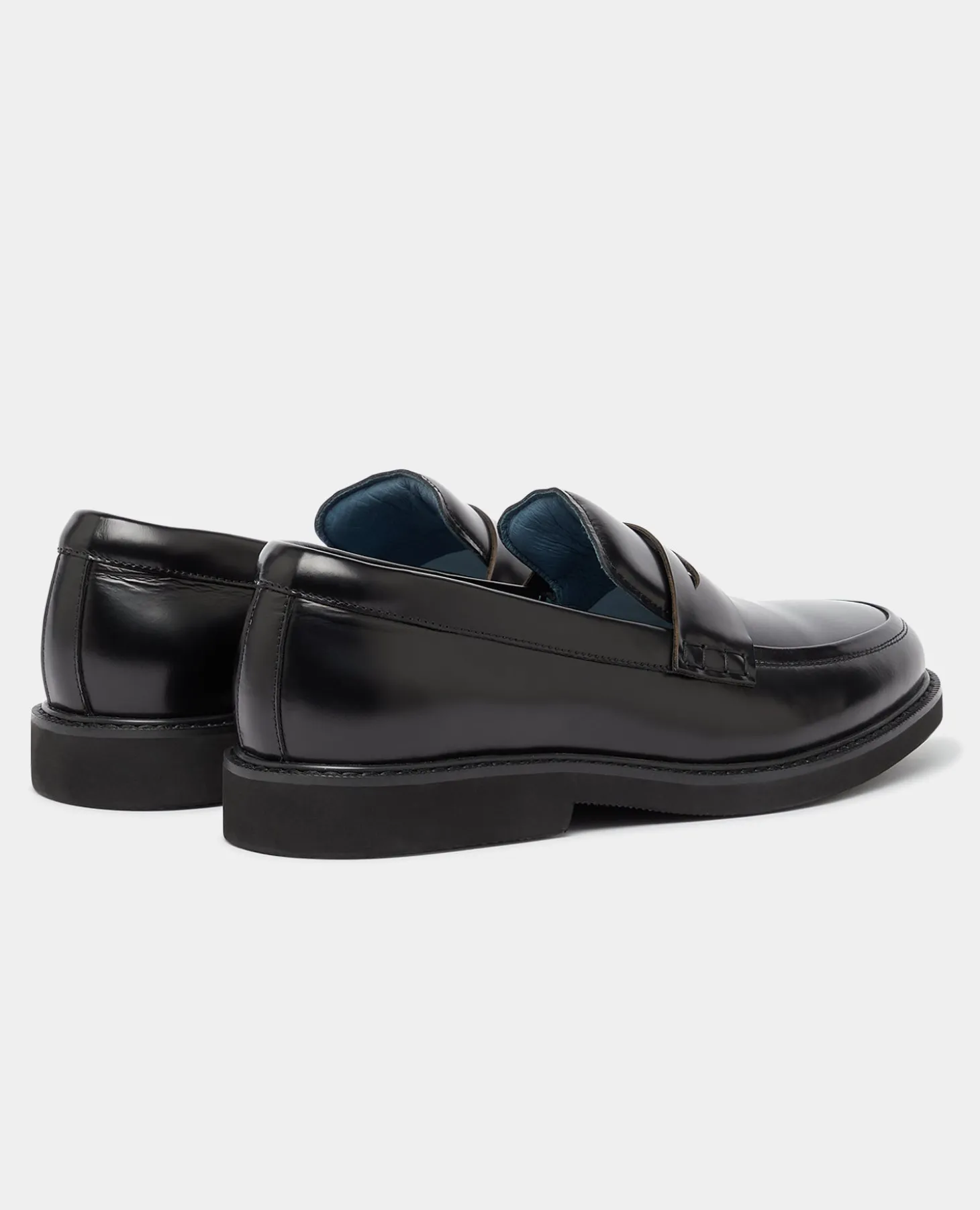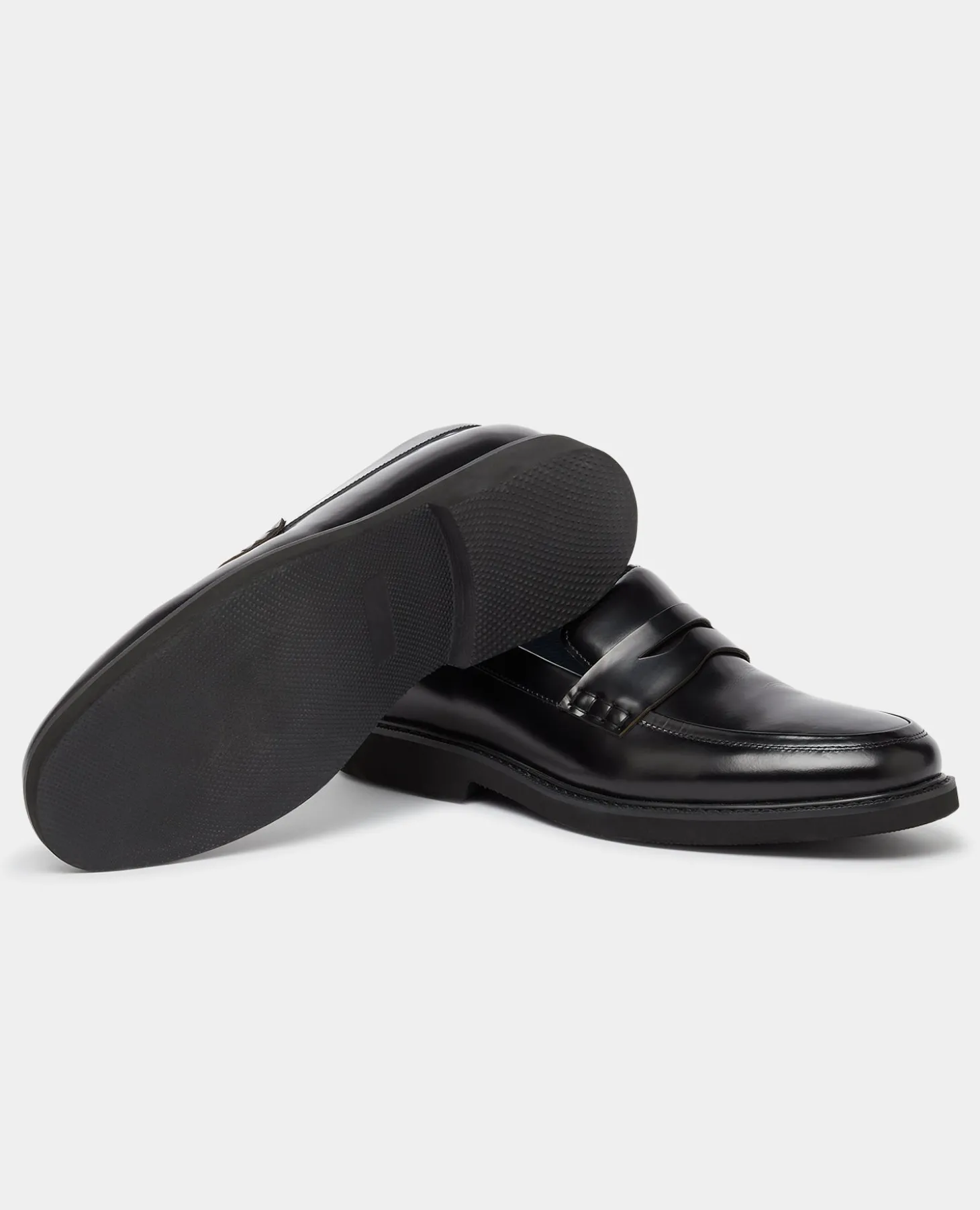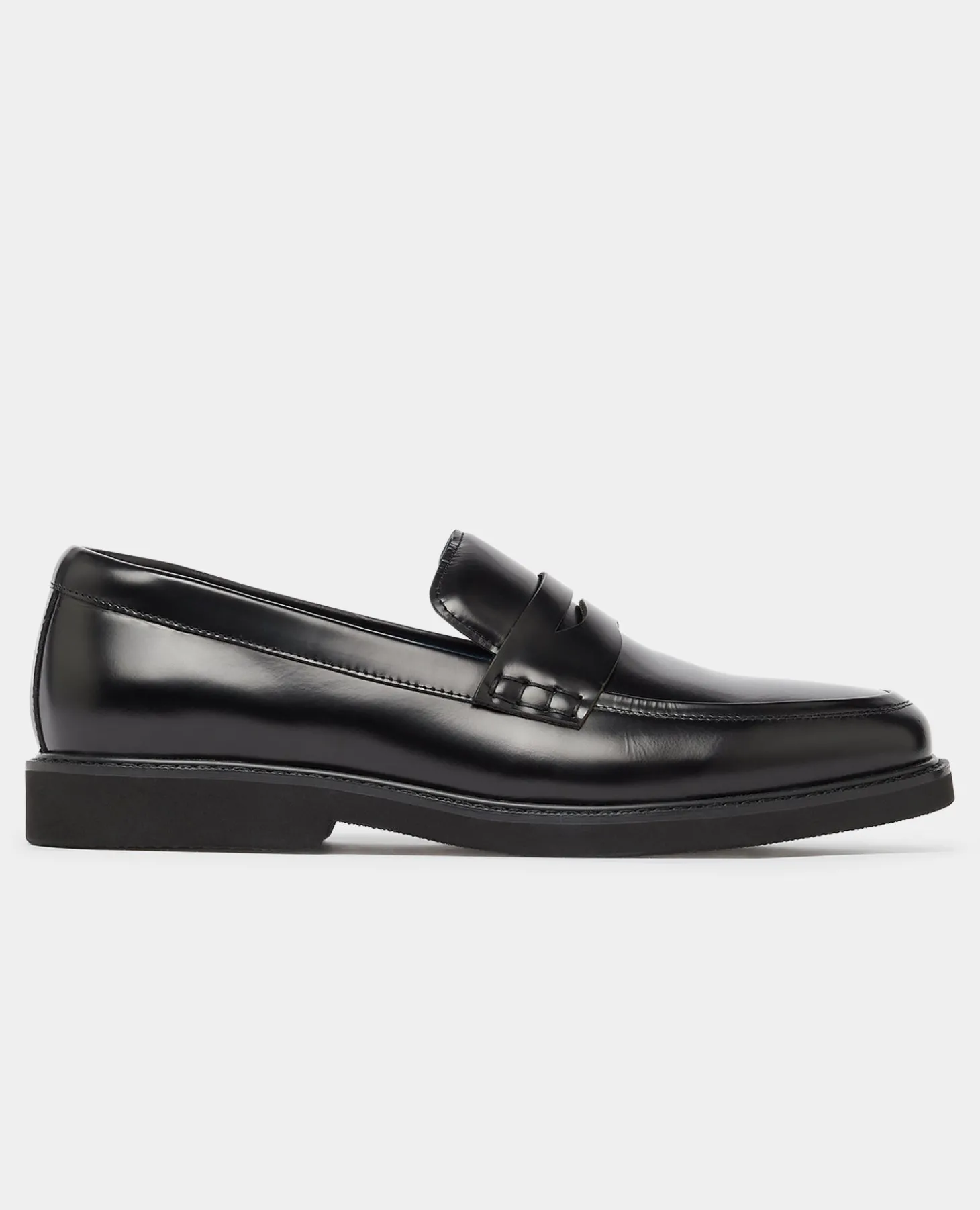 Black leather slip on loafer. Extra lightweight outsole with leather sock and lining