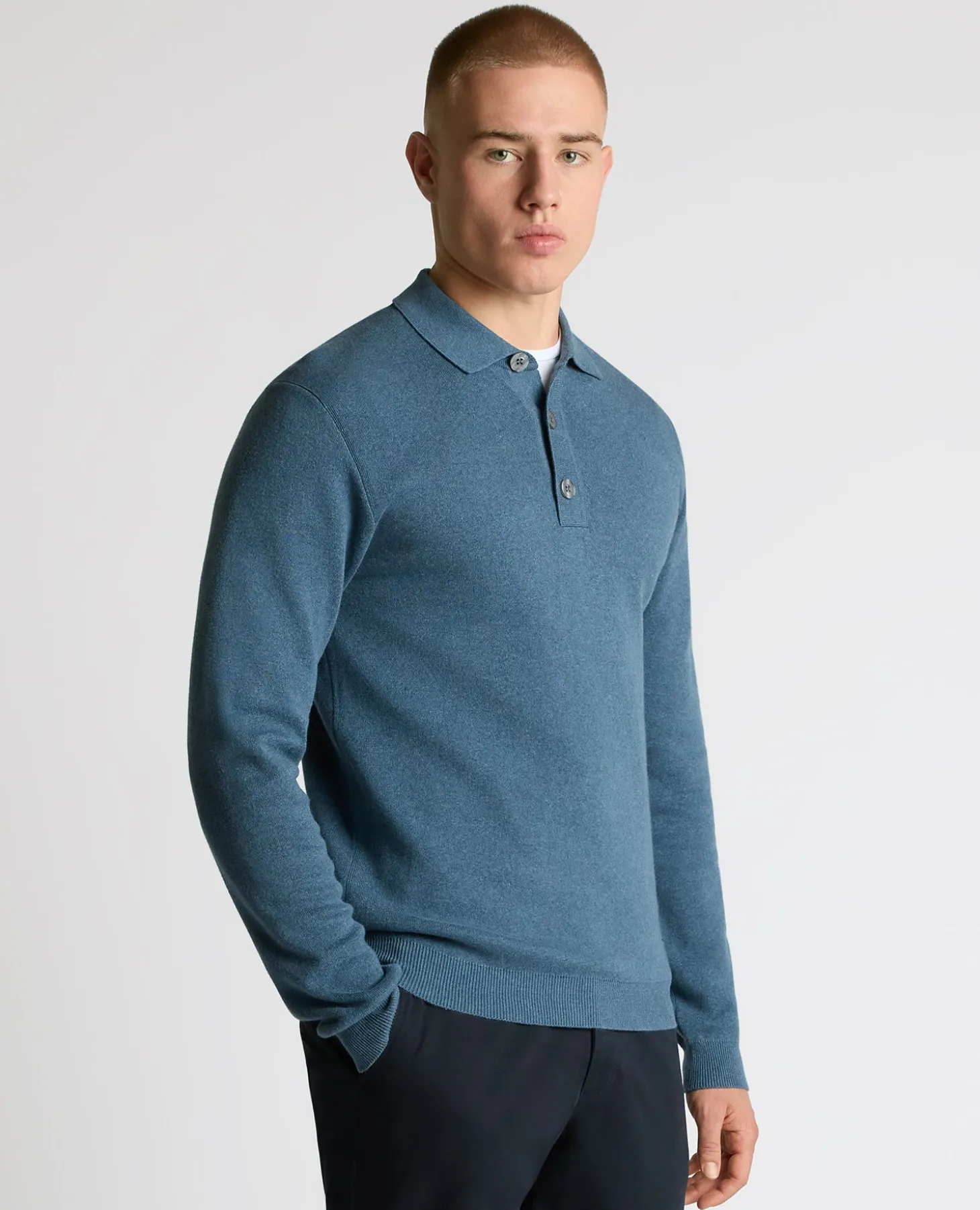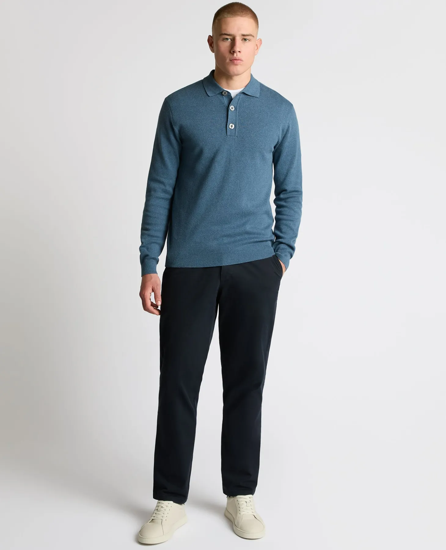Model is 6’2”/188cm tall and wears a tapered fit long sleeve polo shirt in size M. Model has a 15.5 inch collar, a 40” chest and 32” waist.