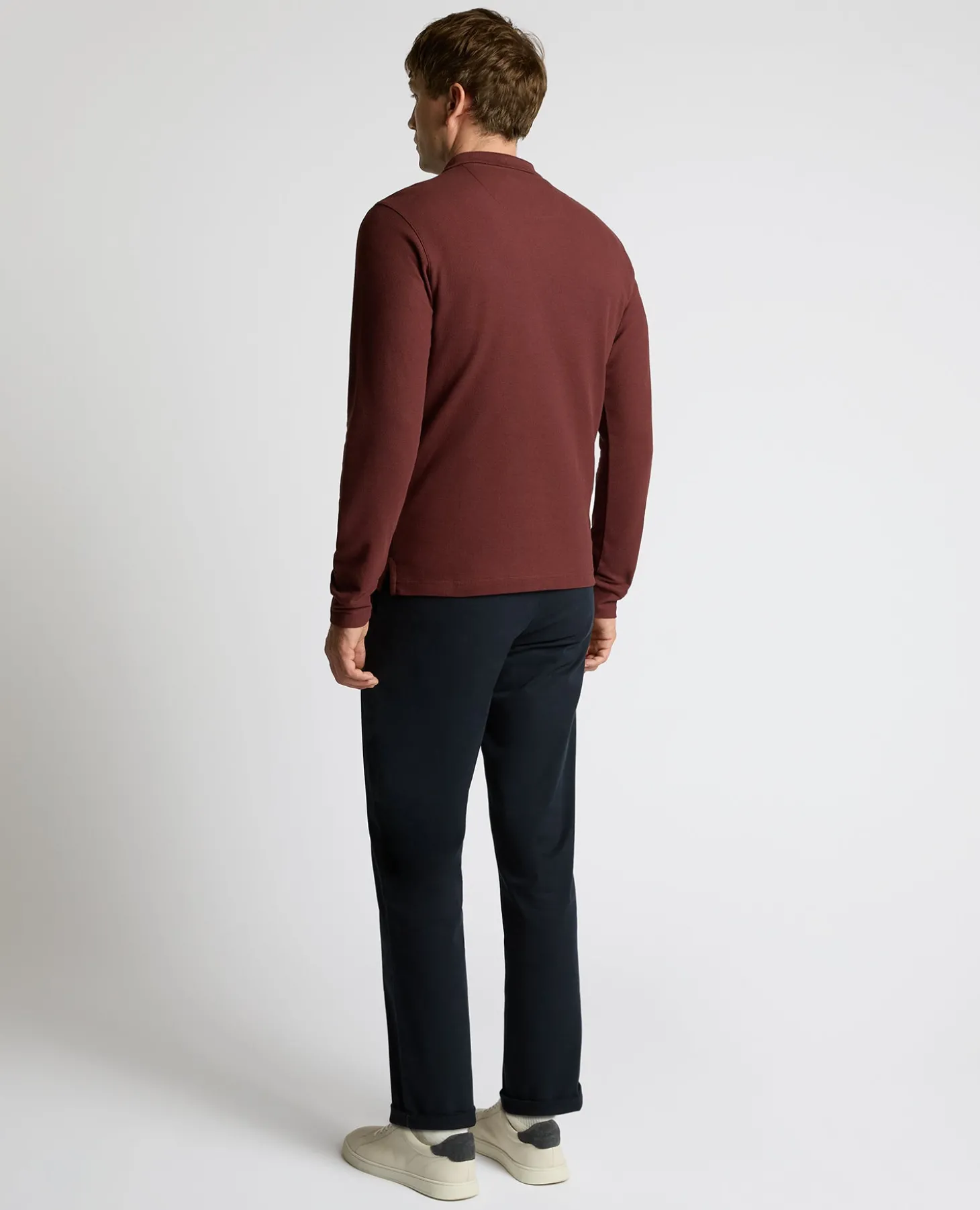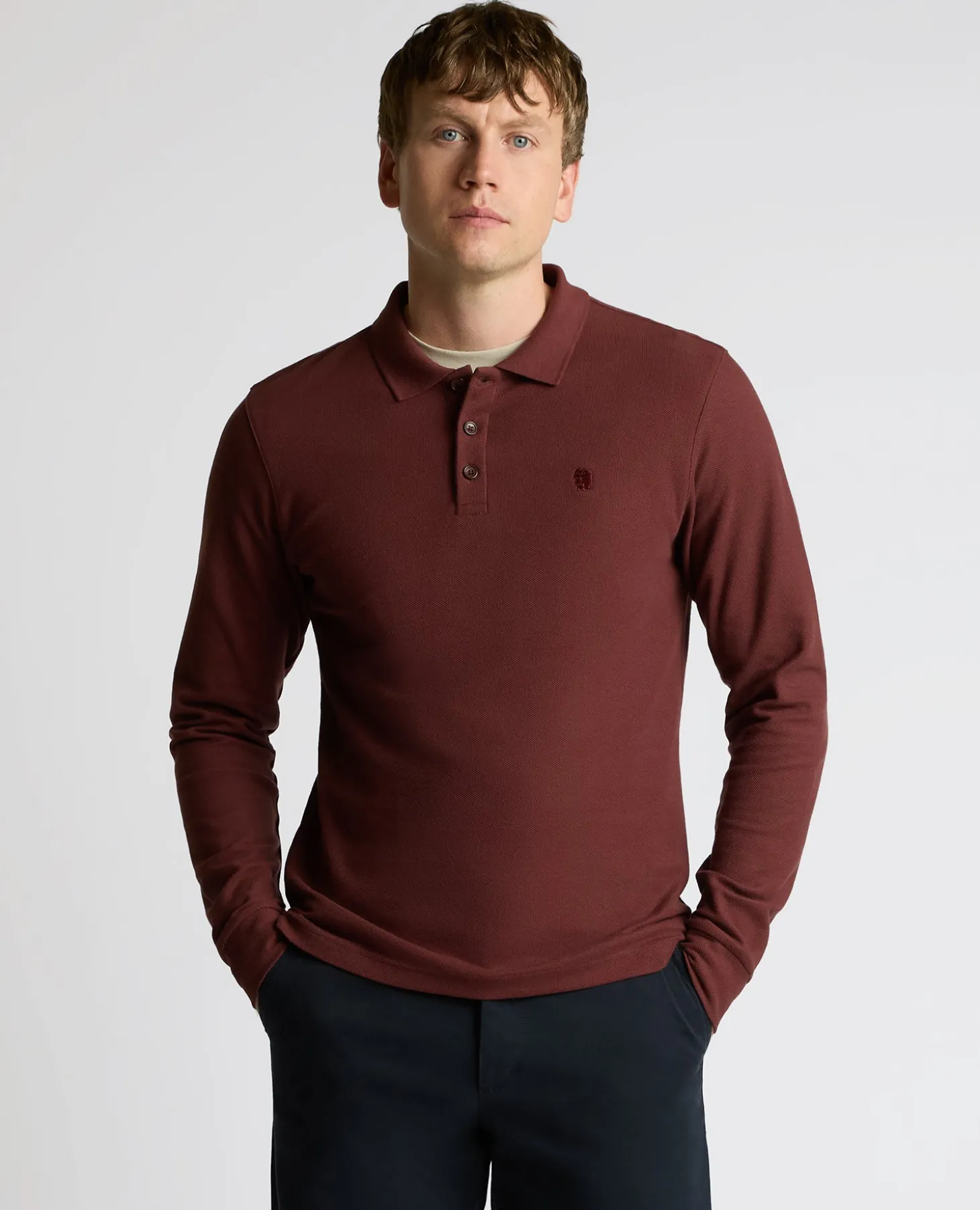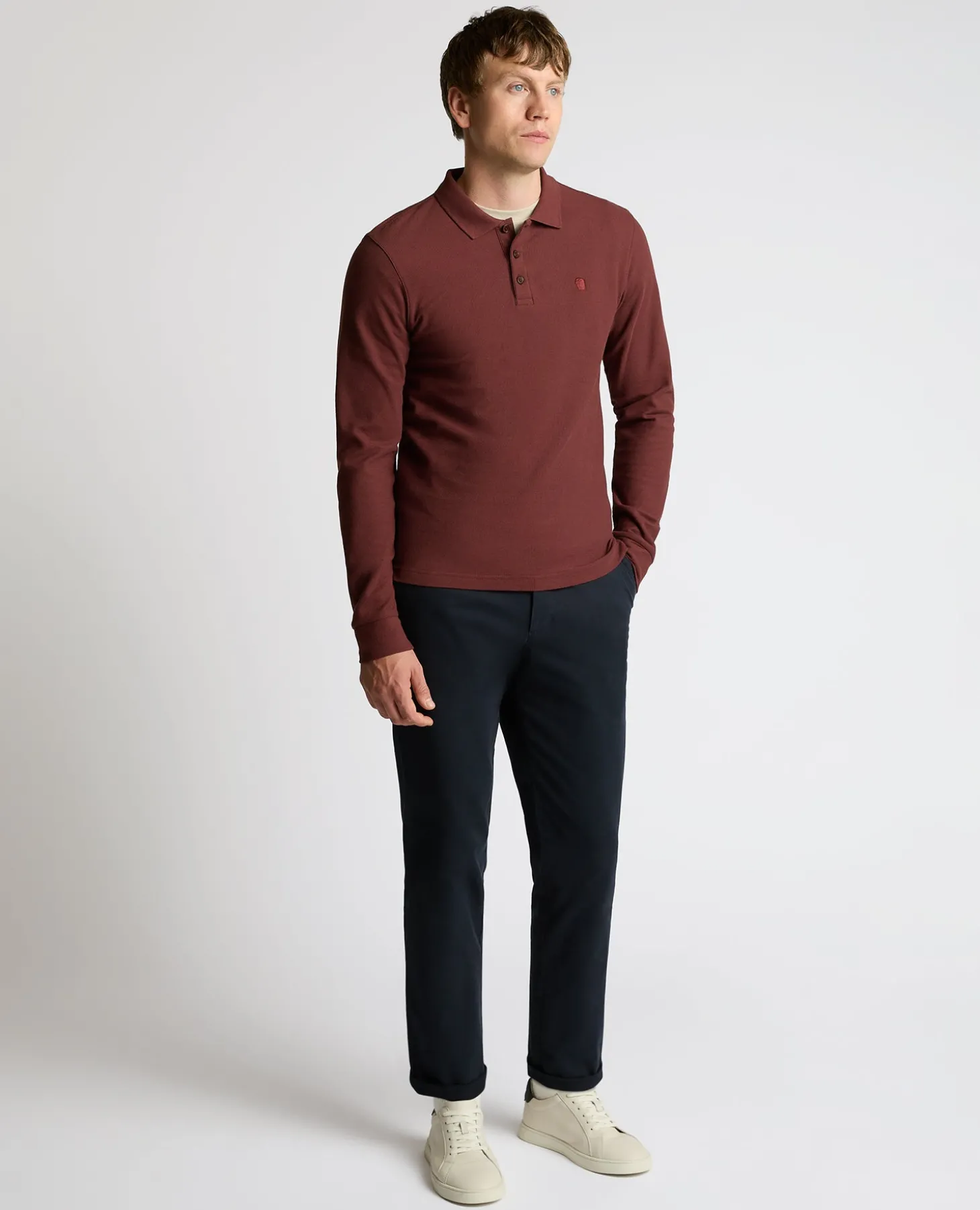 Model is 6’2”/188cm tall and wears a tapered fit long sleeve polo shirt in size M. Model has a 15.5 inch collar, a 40” chest and 32” waist.