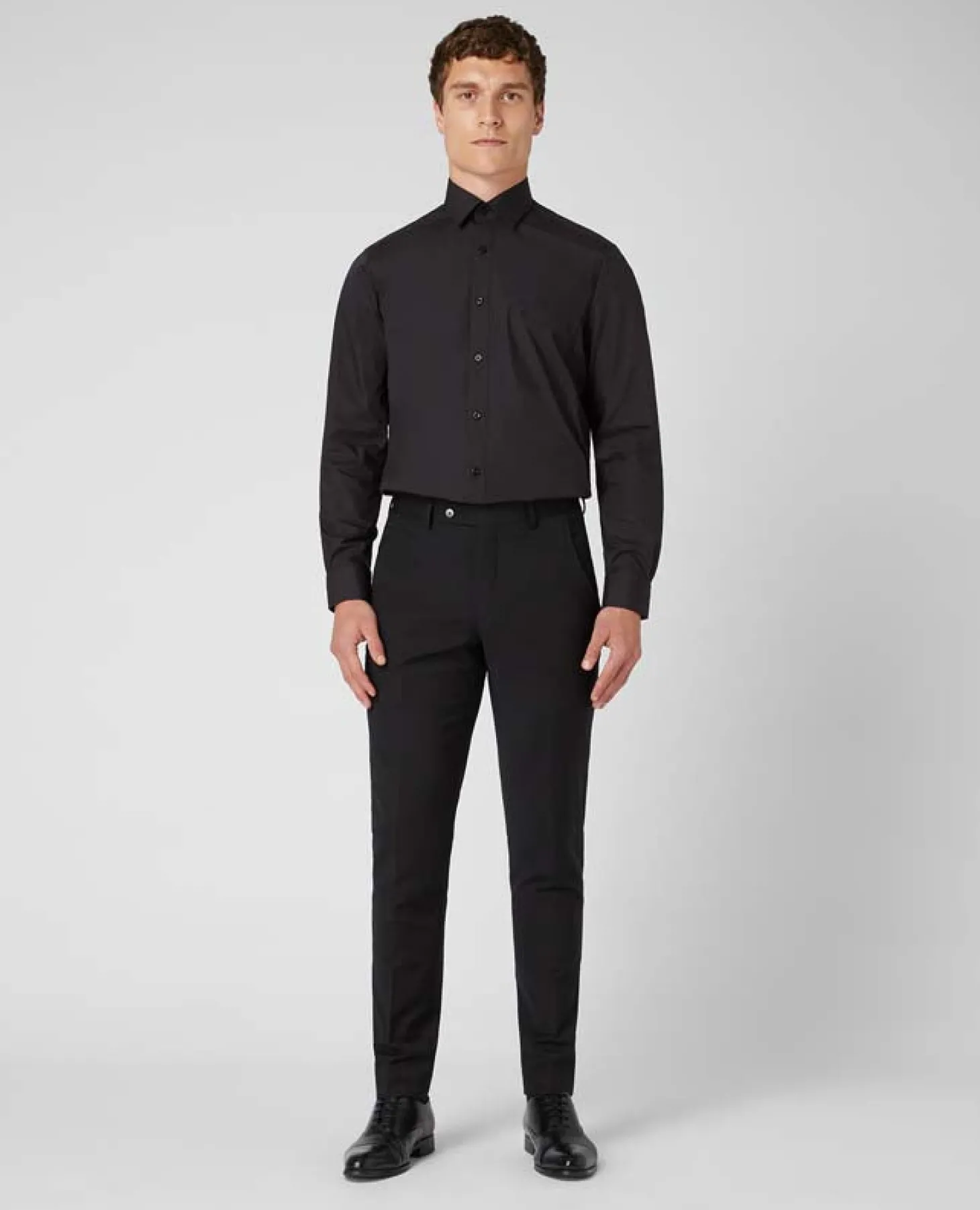 Black relaxed fit long sleeve shirt. Soft Jensen pointed collar, contemporary bluff edge with light weight collar interlining. Placket front, plain cuff patch pocket and tailed hem.