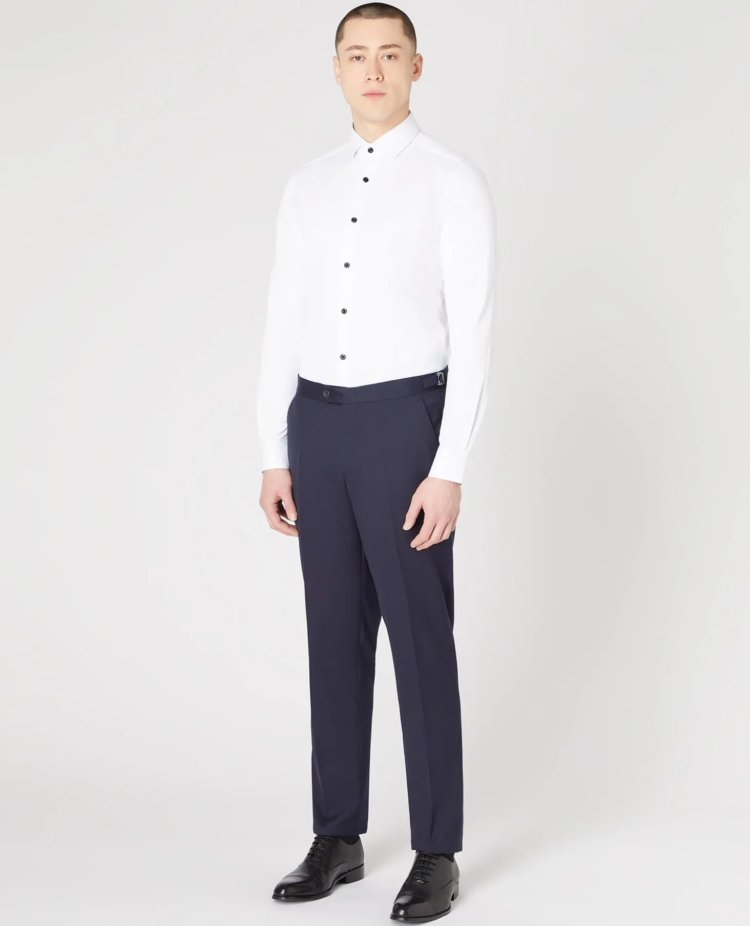 This is formalwear with a modern edge. Note the black buttons that give this shirt a sharper, more contemporary edge, while the cotton-stretch fabric keeps it comfortable through long evenings. Cut slim with a clean collar and subtle detailing, it works perfectly for evening events, weddings, or dressed-up nights out.