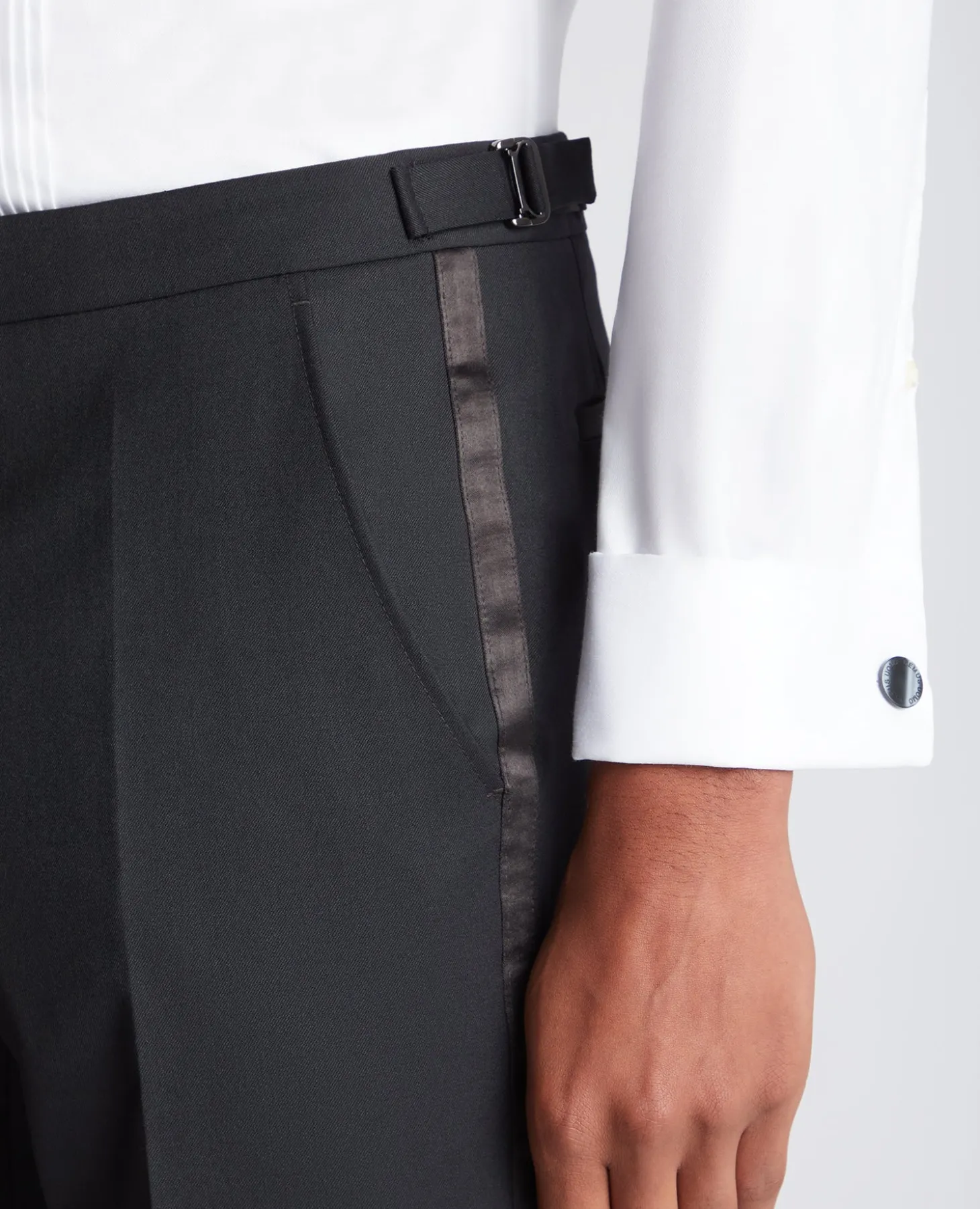 White slim fit cotton-blend shirt, narrow pointed collar with pleated front placket.