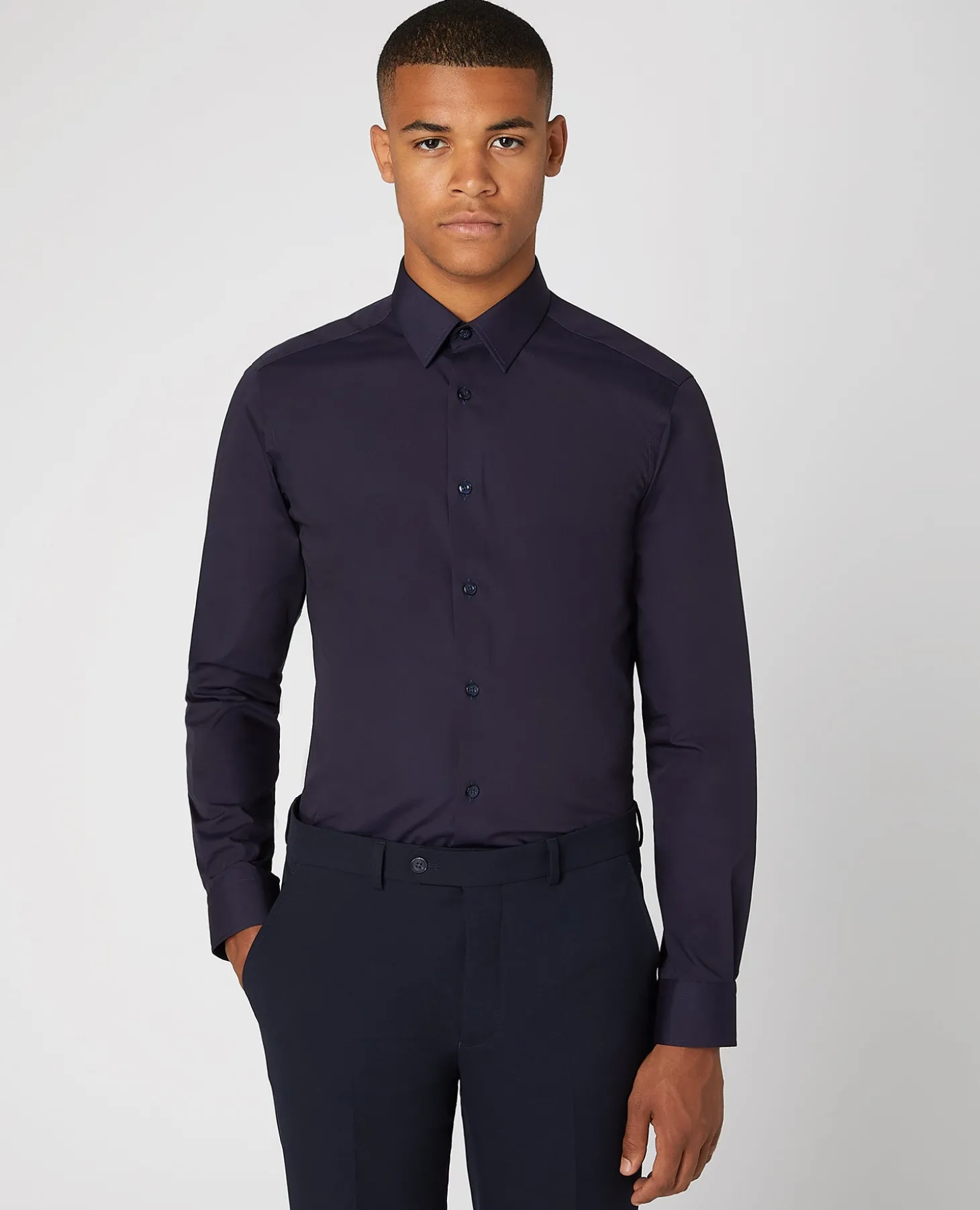 Navy slim fit cotton-blend long-sleeve shirt with french front and narrow pointed collar.