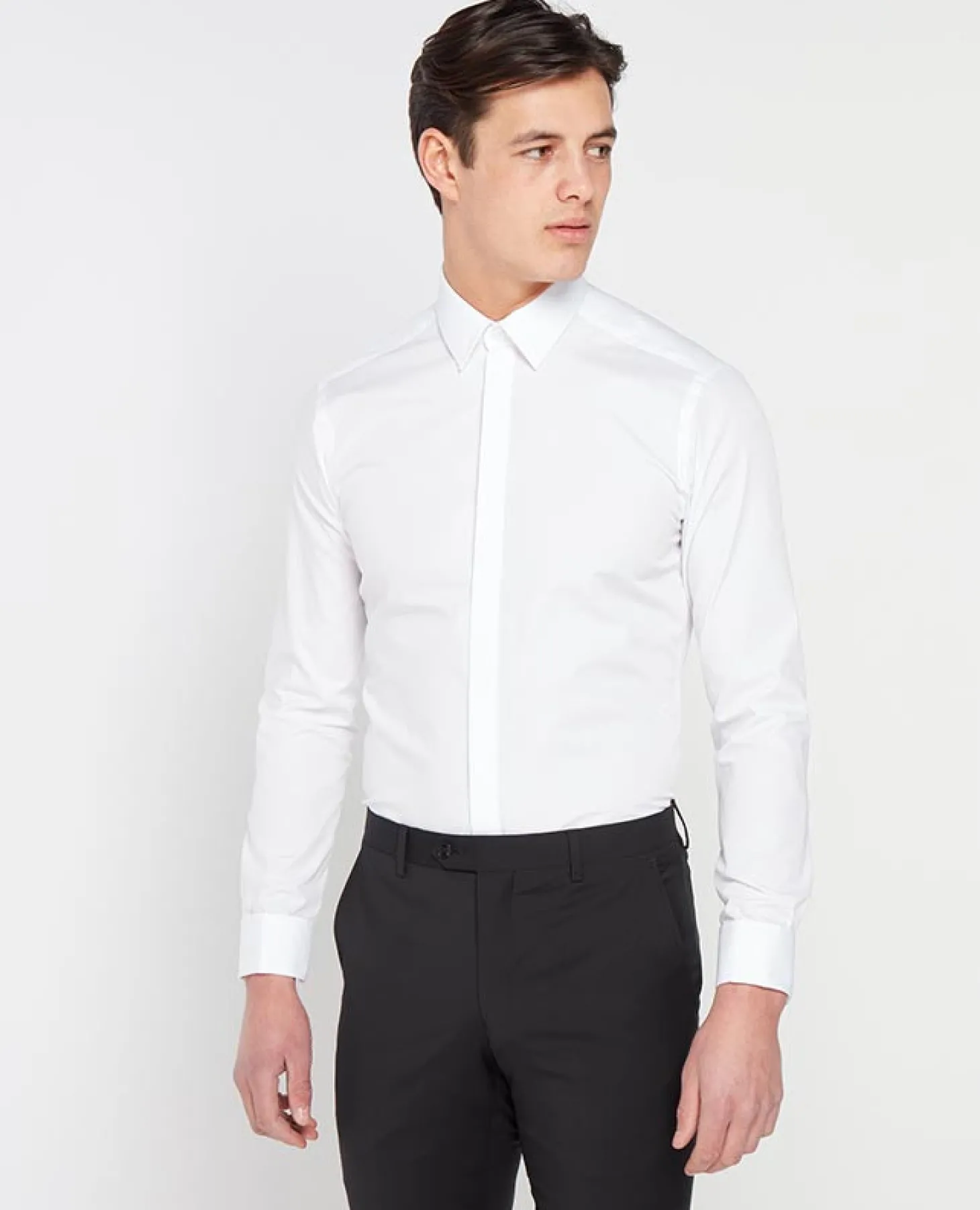White slim fit cotton-blend long-sleeved shirt with narrow pointed collar, concealed button front and double cuff.