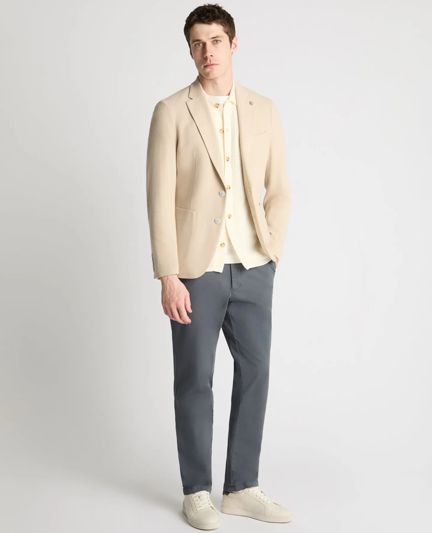 Model is 6’2”/188cm tall and wears a slim fit jacket, size 40R. Our slim fit jackets are expertly tailored to create the perfect slim silhouette, designed for a narrower appearance through the shoulders, arms and chest.