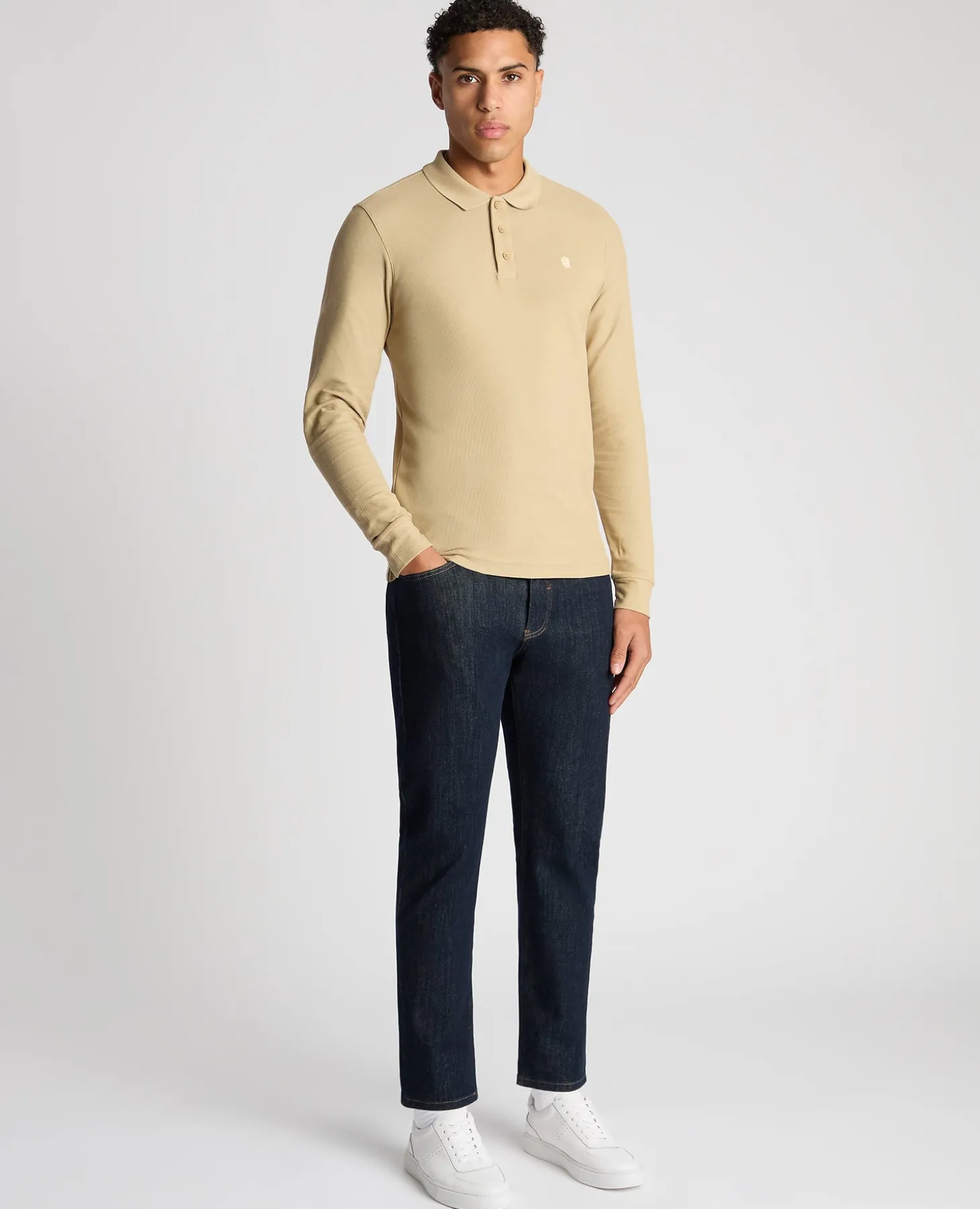 Warm stone slim fit cotton-stretch long sleeve pique polo with chest embroidery, contrast tipping on the collar and three button closing. If you prefer an easier fit , we recommend sizing up for this garment.