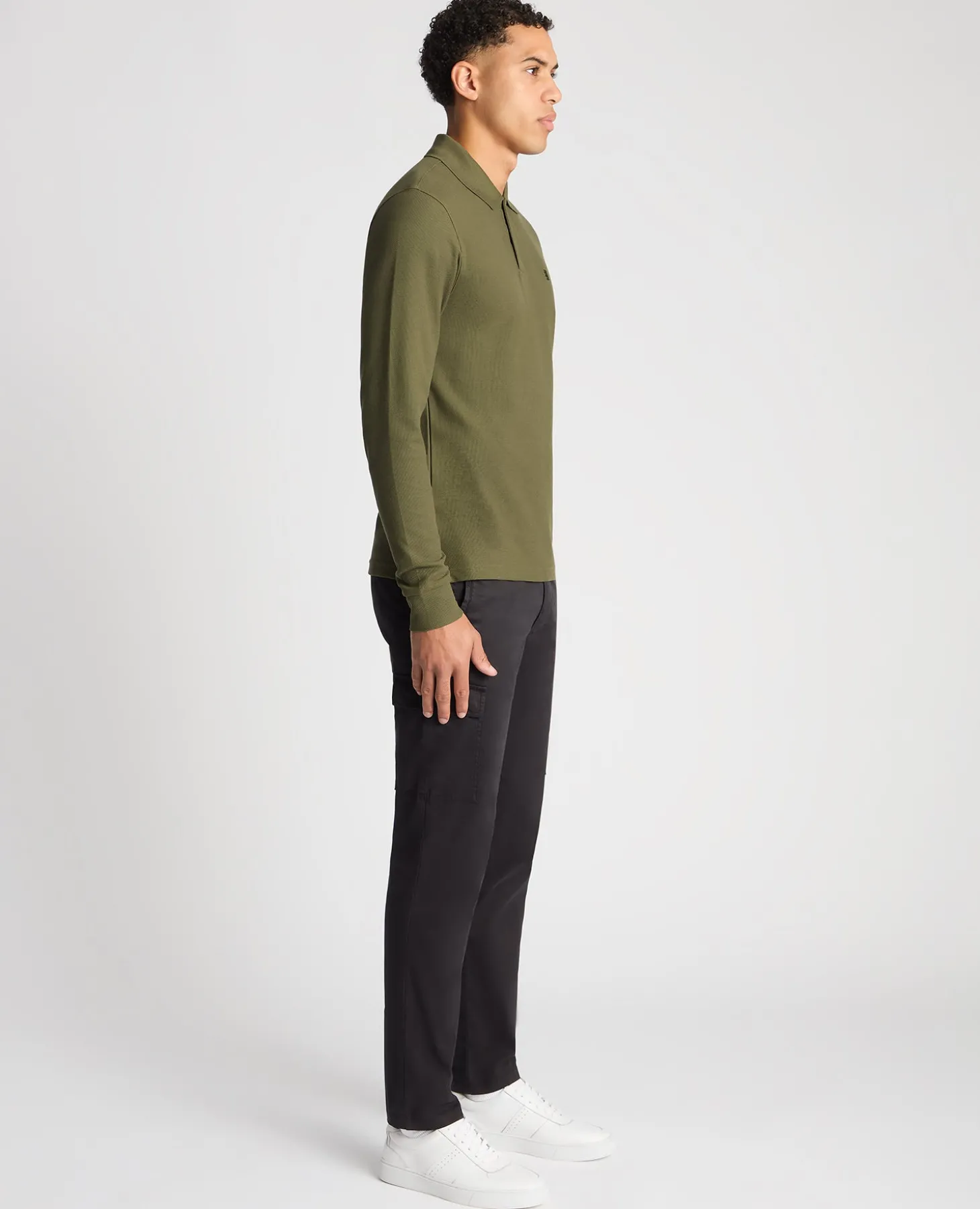 Khaki slim fit cotton-stretch long sleeve pique polo with chest embroidery, contrast tipping on the collar and three button closing. If you prefer an easier fit , we recommend sizing up for this garment.