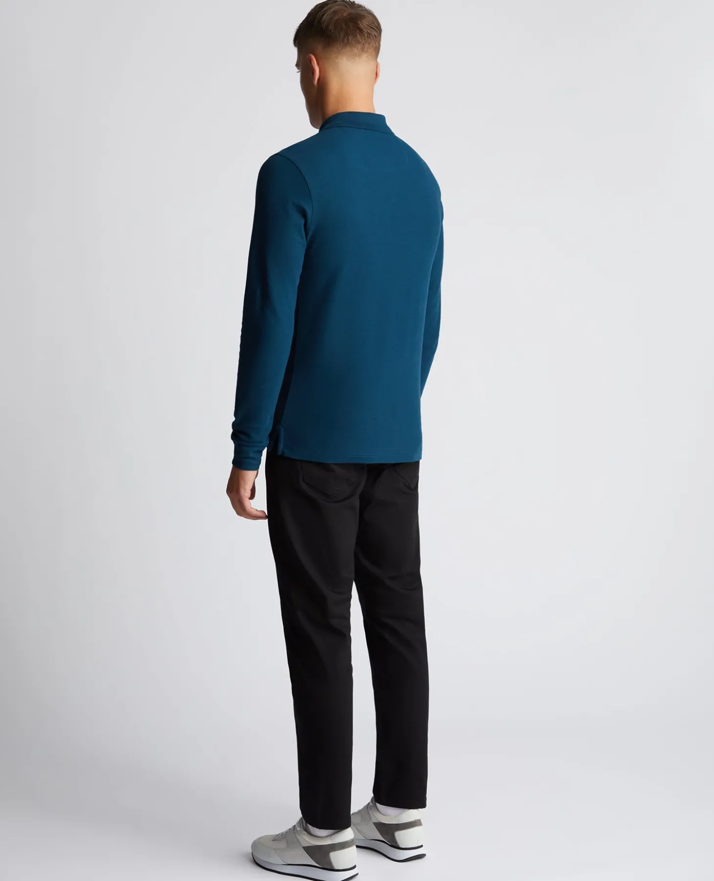 Dark blue slim fit cotton-stretch long sleeve pique polo with chest embroidary, contrast tipping on the collar and three button closing. If you prefer an easier fit , we recommend sizing up for this garment.