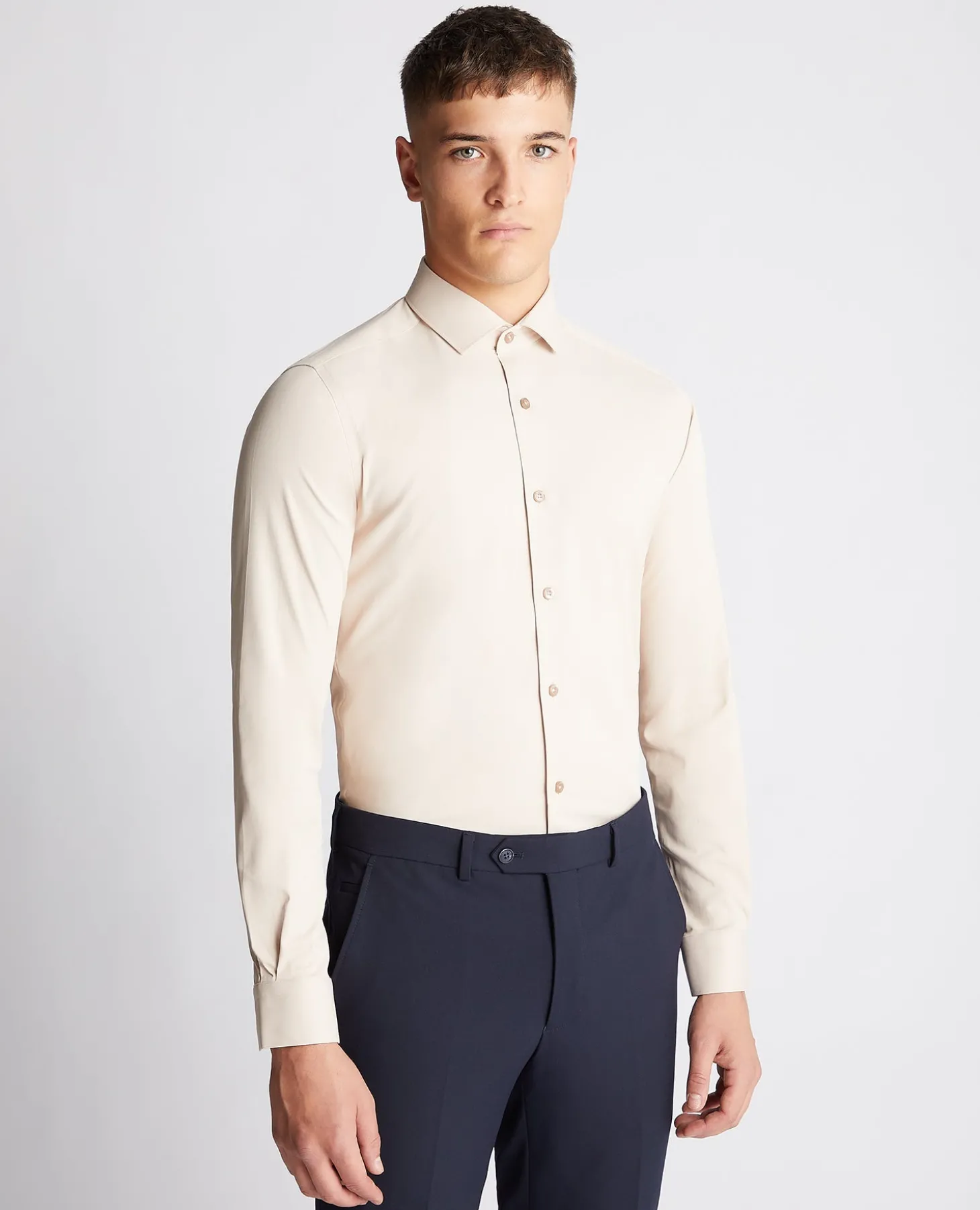Beige slim fit cotton stretch long-sleeved shirt with french front and spread collar.