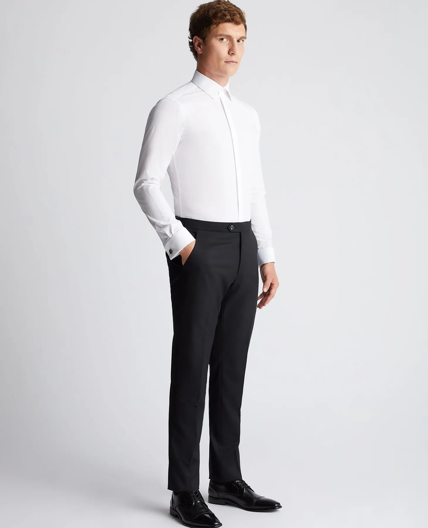 Model is 6’2” /188cm tall and wears a trouser size 34R. Our slim fit trousers are expertly tailored to create the perfect slim silhouette, designed for a narrower appearance through the leg and at the hem.
