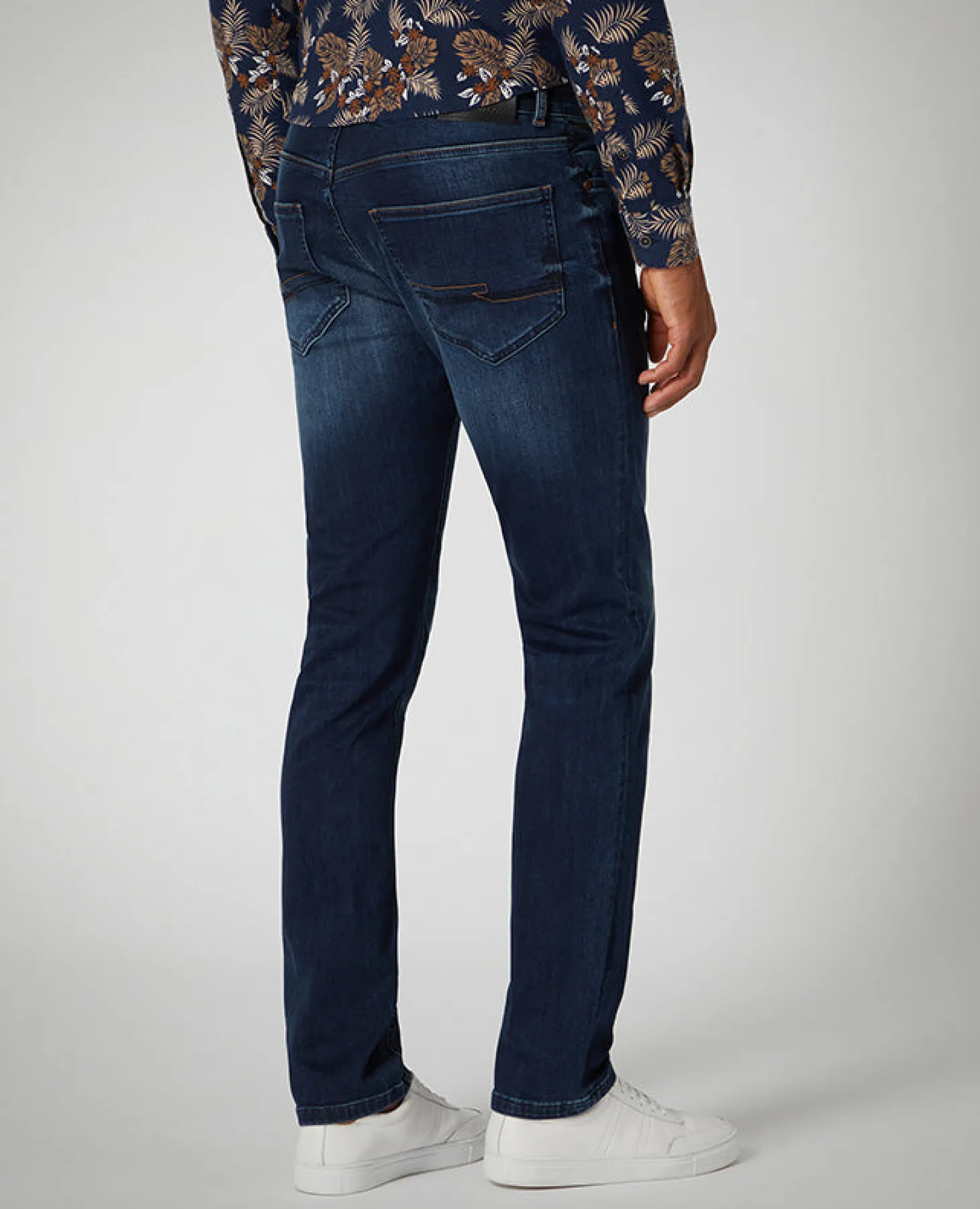Dark blue slim leg cotton jeans with power stretch fabric.
