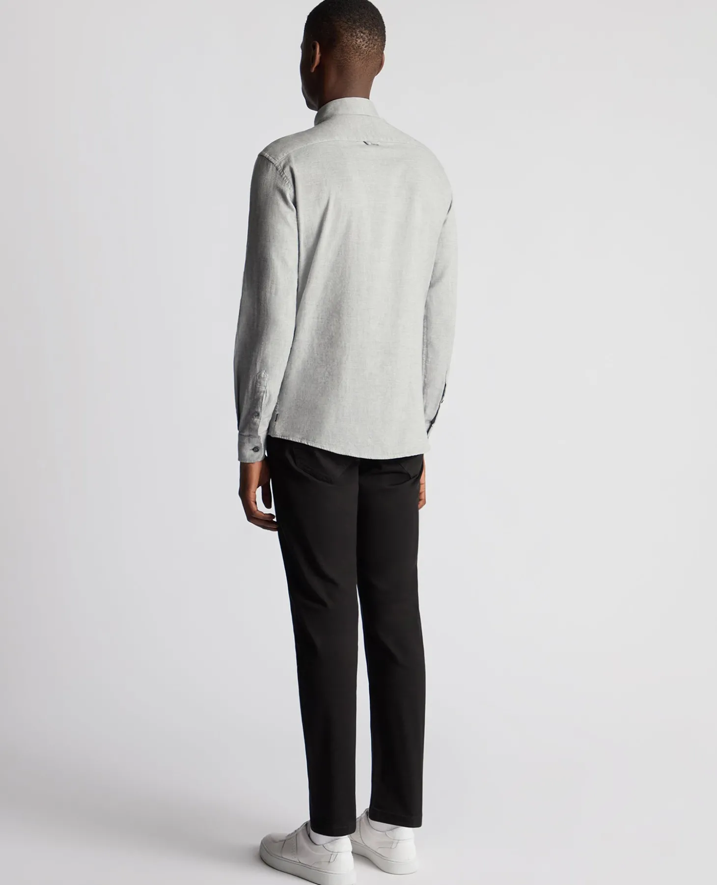 Grey tapered fit shirt. Soft brushed cotton feel. Buttoned down collar, placket front, contrast ribbon, chest embroidery with a back yoke loop and tailed hem.