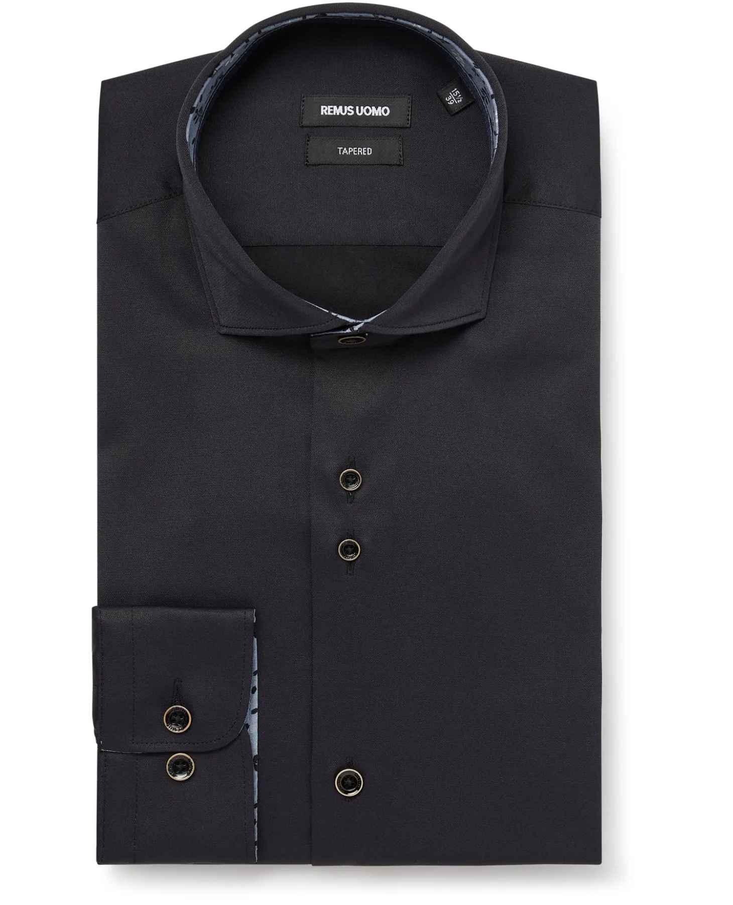 Black tapered fit cotton-blend stretch shirt, blue floral trim and cut away collar