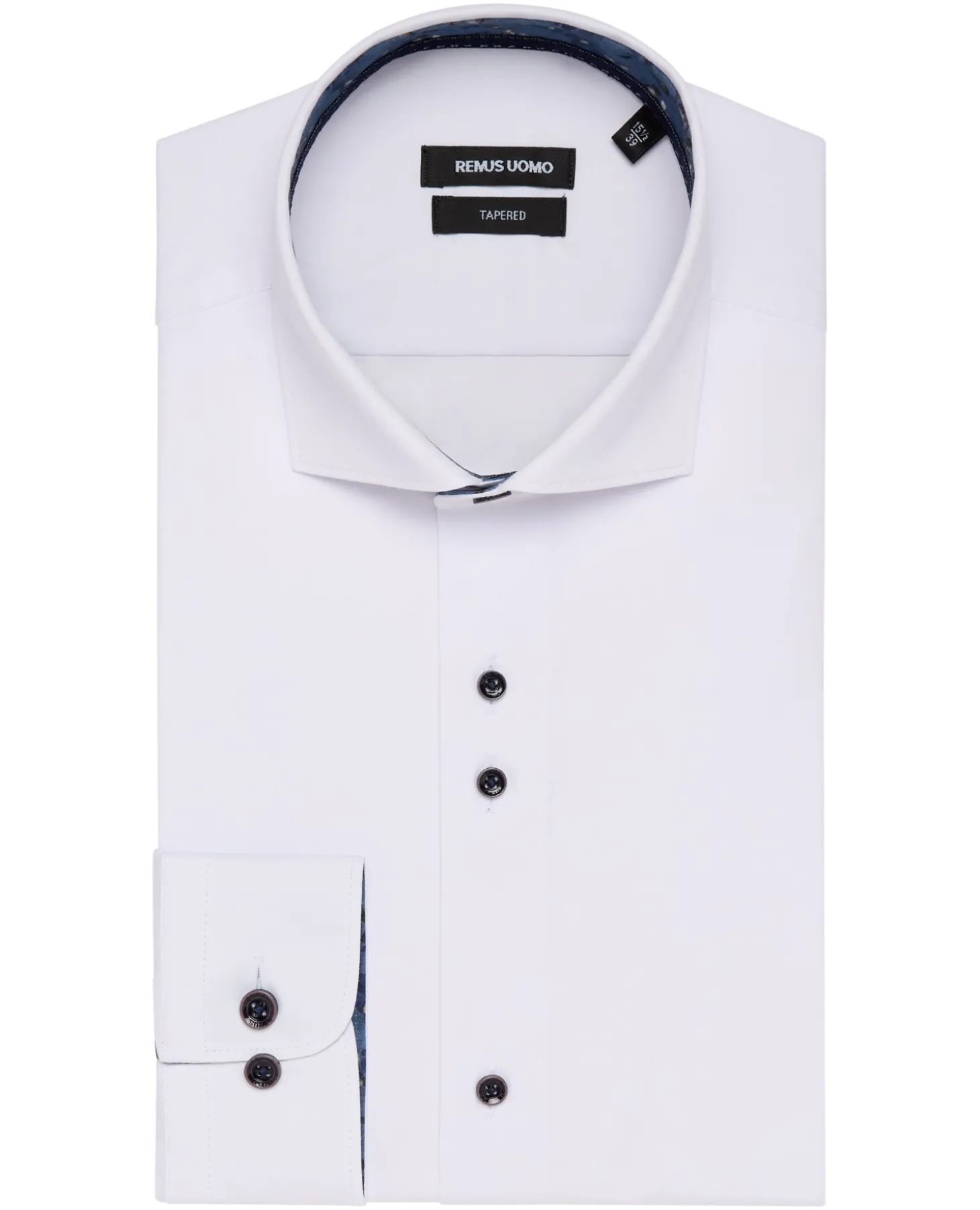 White tapered fit cotton-blend stretch shirt, contrast innder collar, concealed button down, and slightly cut away collar.