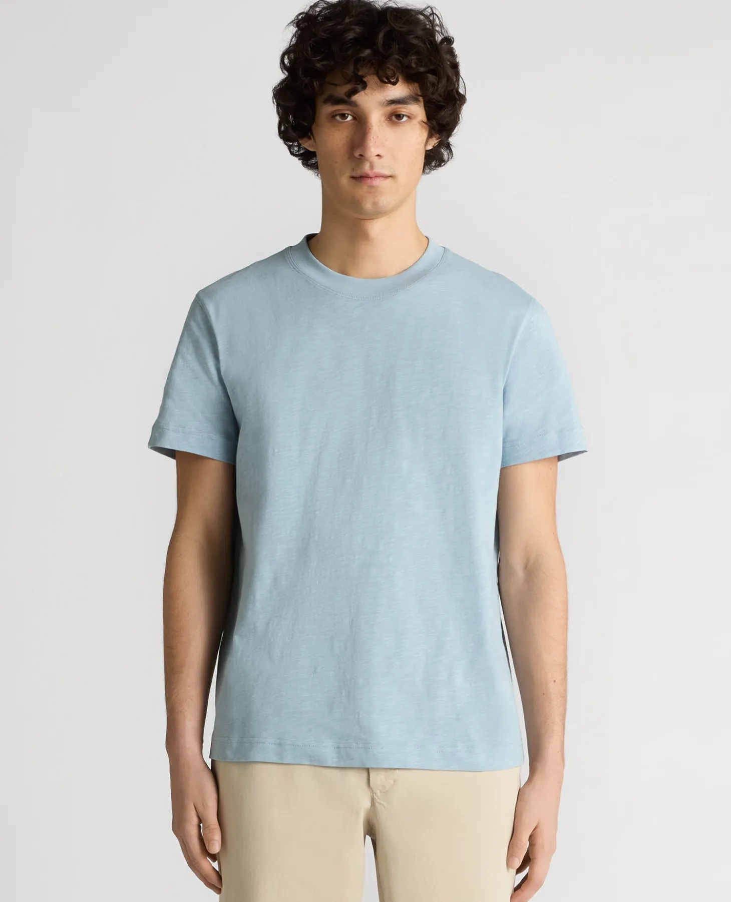 Light blue tapered fit cotton crew neck t-shirt in single jersey slub yarn. Lightweight and breathable in 100% Cotton, making it the perfect tee for spring/summer.