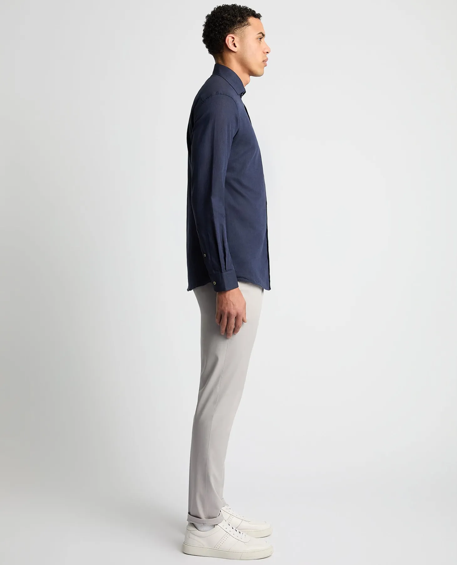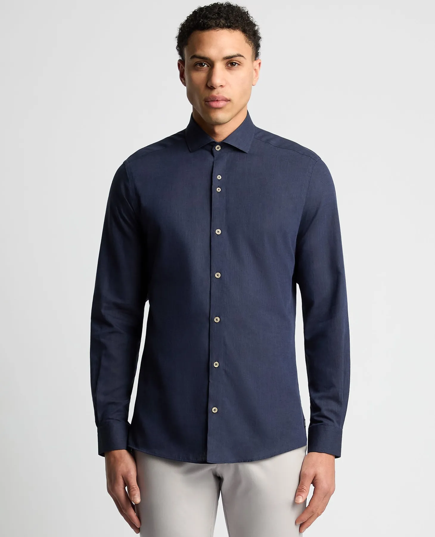 Navy tapered fit long sleeve shirt. Cut away collar, french front, concealed button down, round cuff and tailed hem. This shirt is 70% Cotton and 30% Linen, making it the perfect spring/summer wardrobe staple.