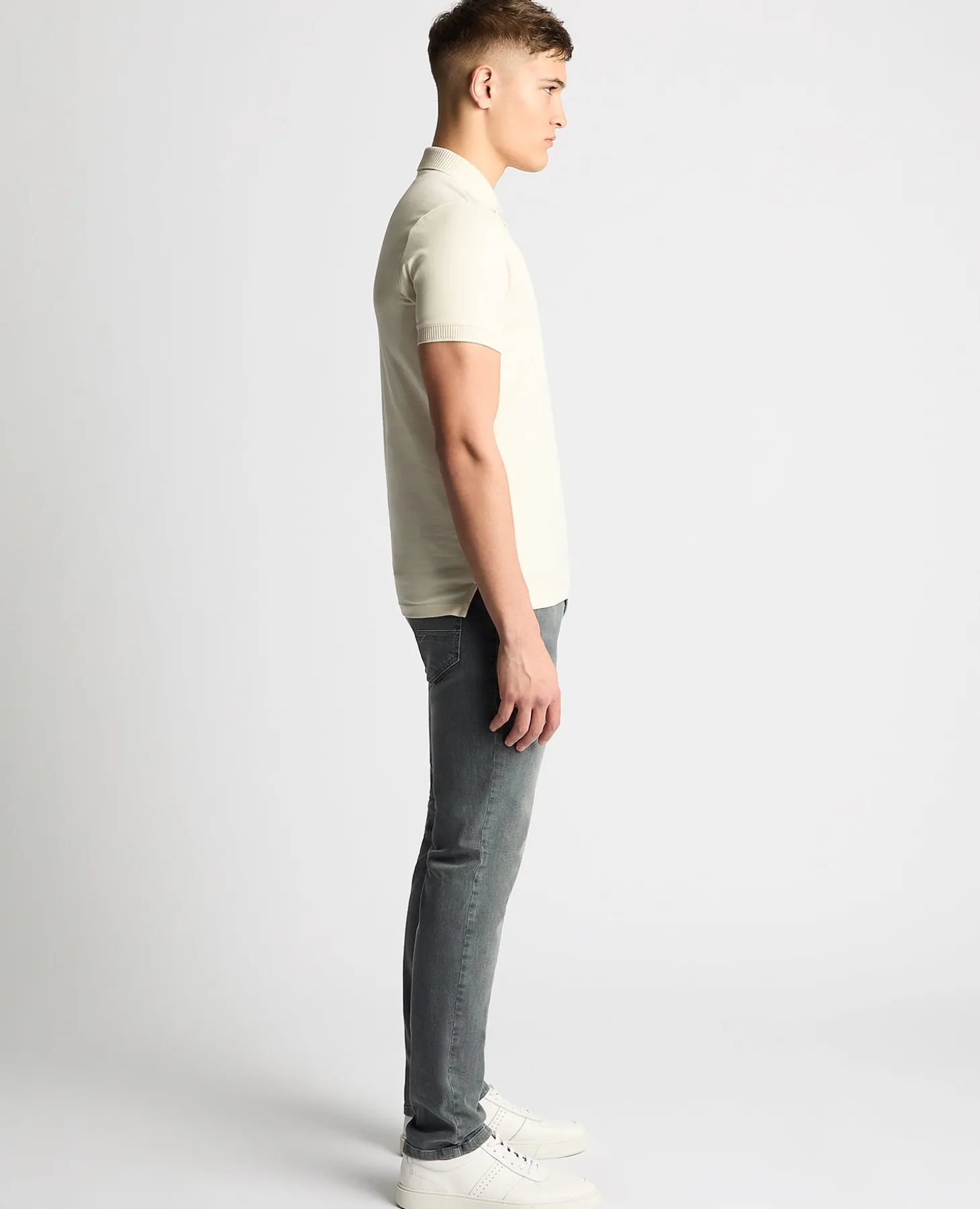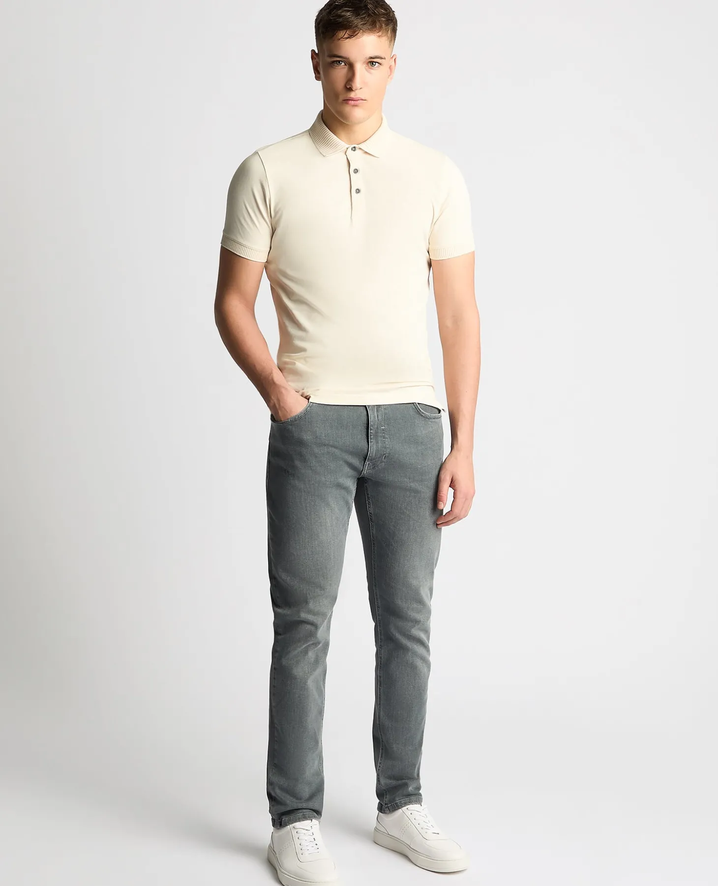 Warm stone tapered fit 95% cotton polo shirt with stretch. Three button closing and feature ribbed collar and cuff.