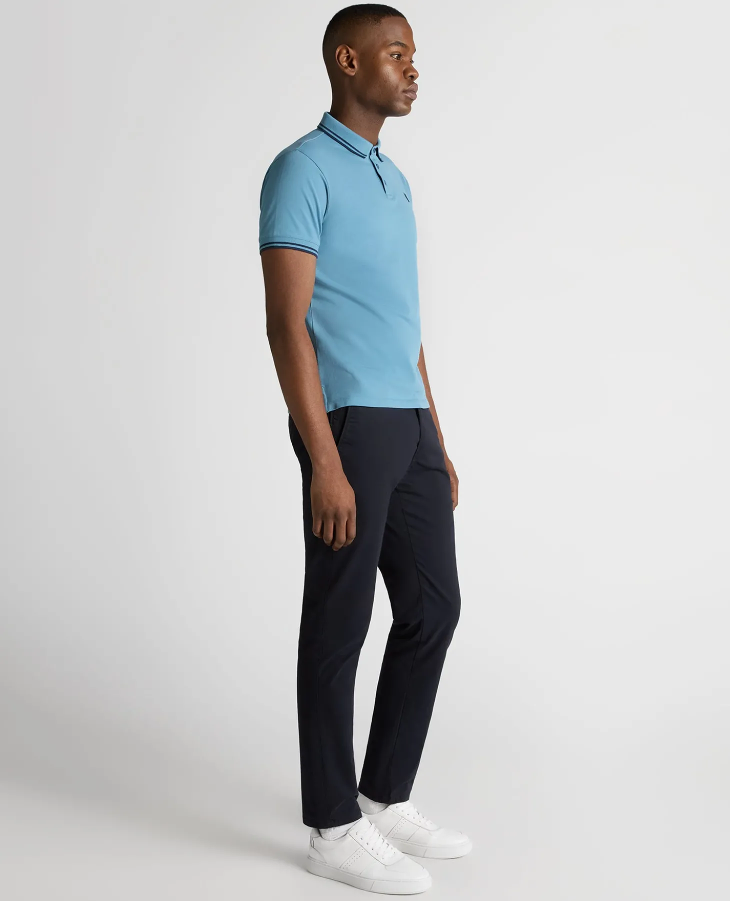 Blue tapered fit cotton-stretch 3 button pique polo shirt with embroidery on the chest and feature navy tipping on the collar and cuff.