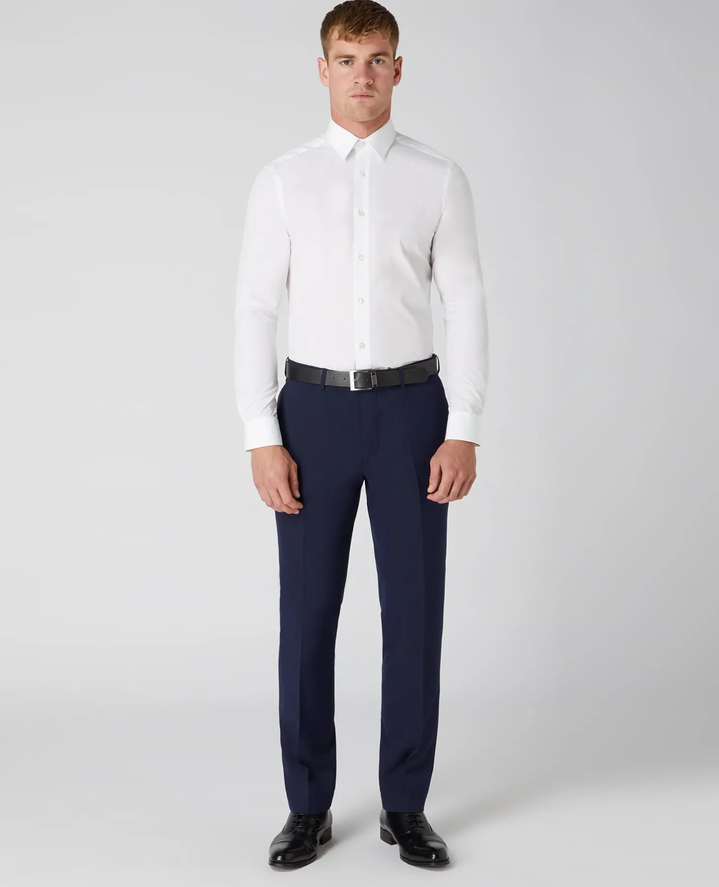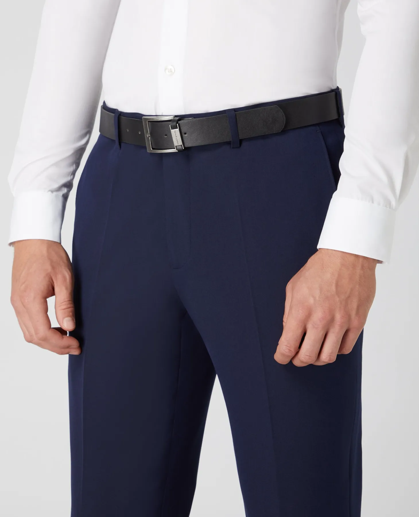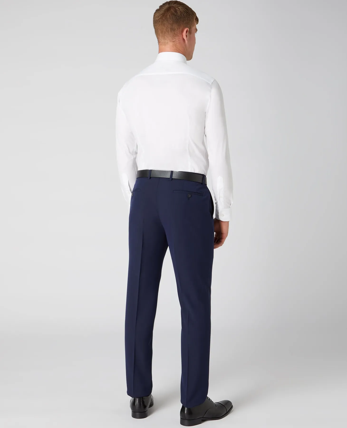 Navy tapered fit formal trousers with stretch fabric and contrast stitch details. Mid rise, slim seat and thigh with slim hem.