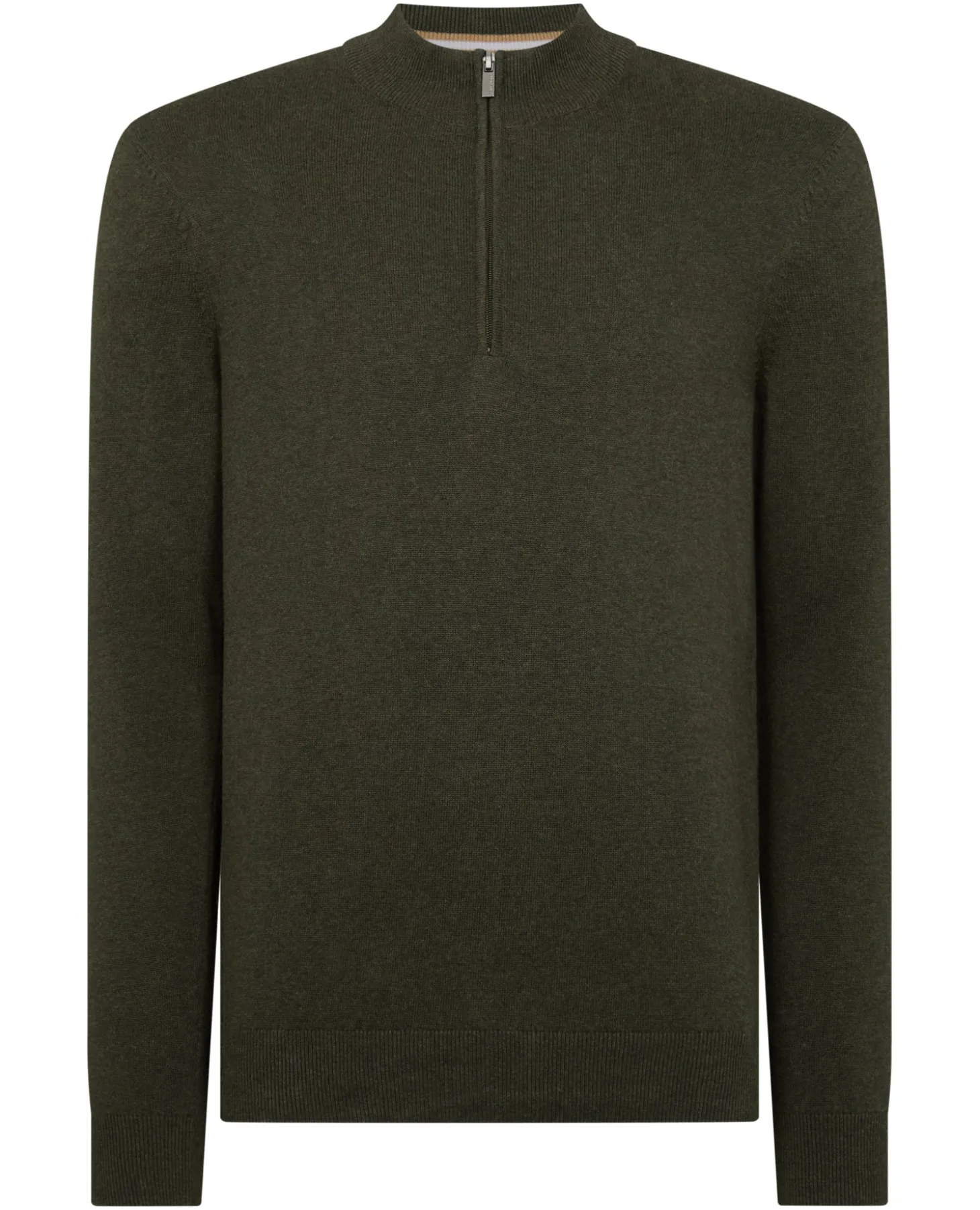Dark green tapered fit half zip cotton sweater, with single bed knit and contrast inside collar details.