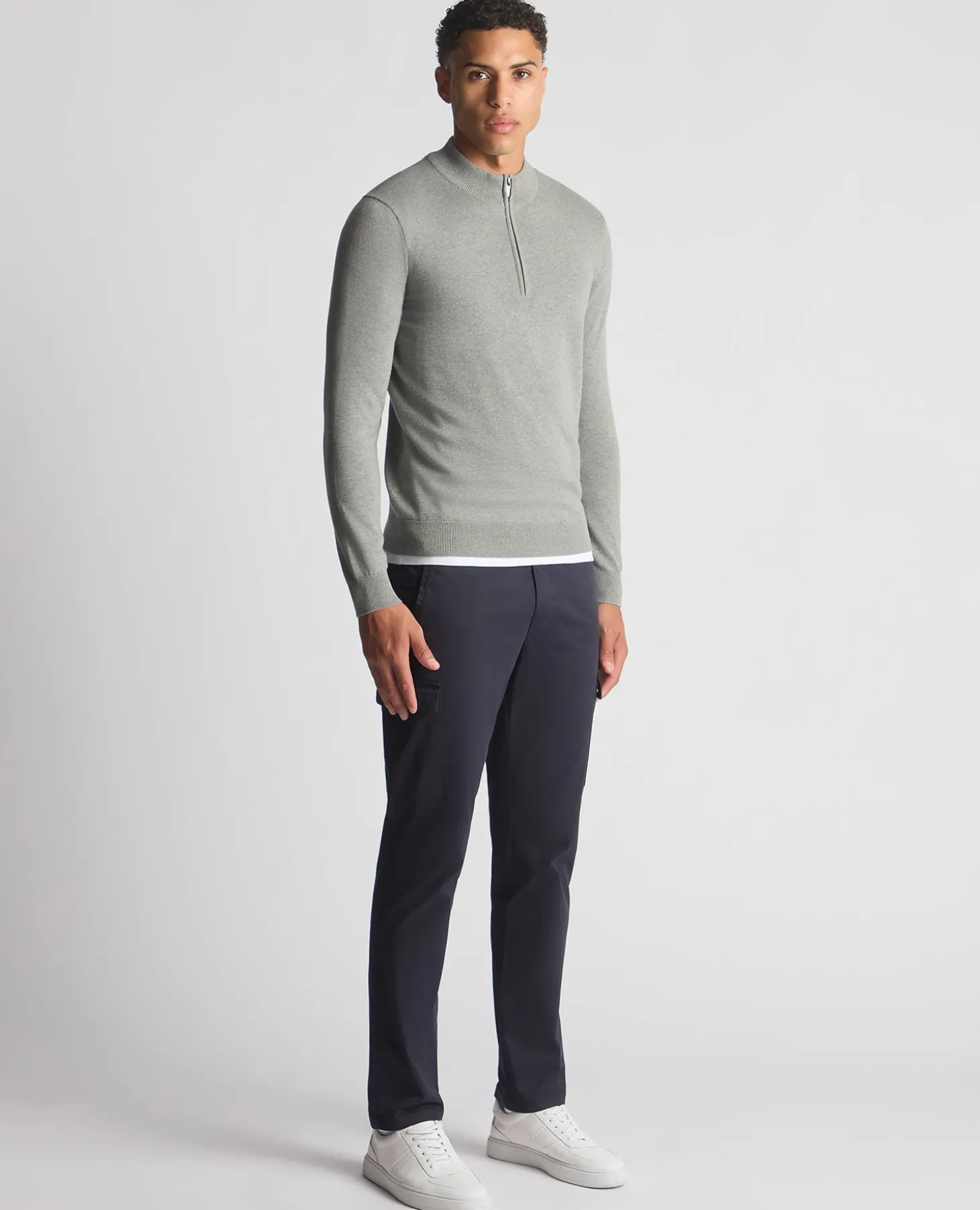 Grey tapered fit half zip cotton sweater, with single bed knit and contrast inside collar detailing.