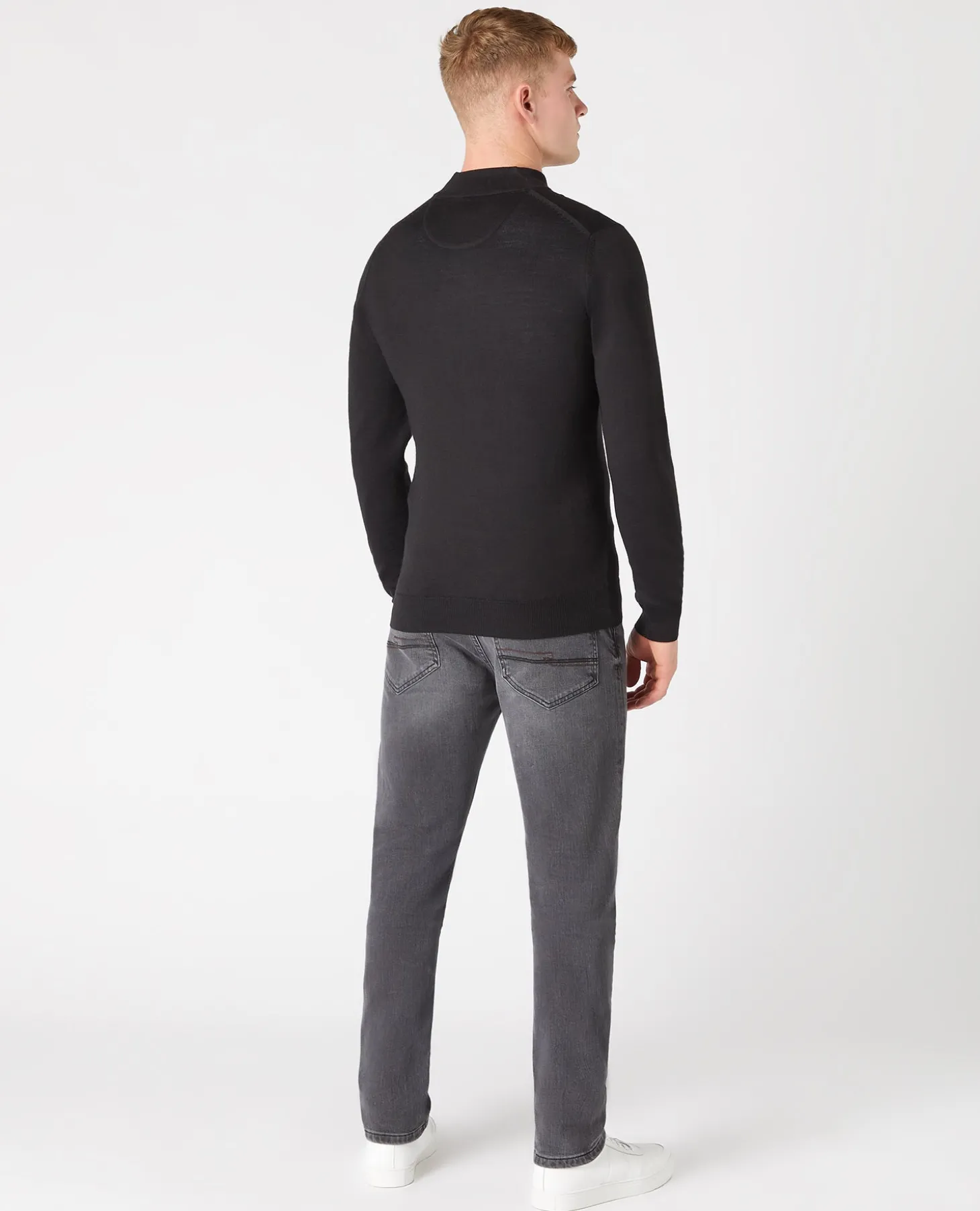 Black tapered fit merino wool-blend half zip long sleeve, single bed knit sweater with contrast inside collar details and ribbed cuff and hem.